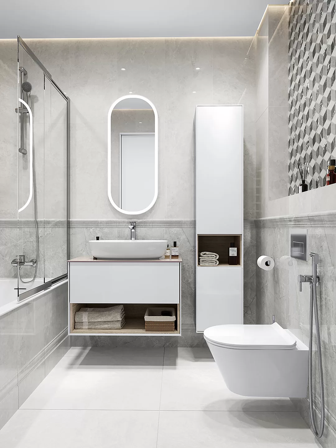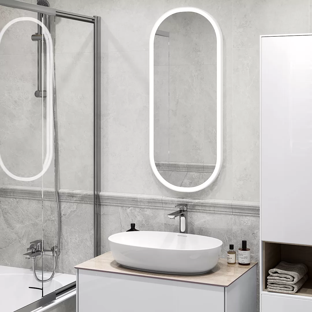 Настенная плитка стала отличным дополнением для основного ассортимента «Риальто», куда входят разновидности керамического мрамора разнообразных текстур и оттенков. Представленный в серии керамогранит — это и традиционный серый мрамор, и другие цвета, включая эффектные бирюзовый и бордовый. При этом каждый из цветов керамического гранита представлен пятью вариантами графики, благодаря чему достигается поистине природное разнообразие рисунка в раскладке.