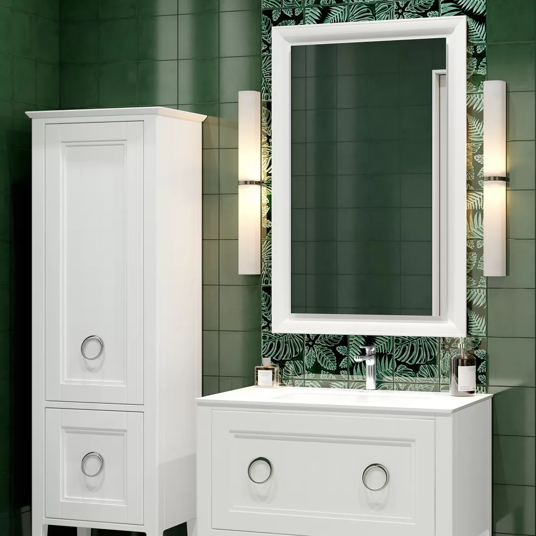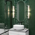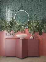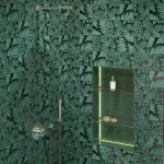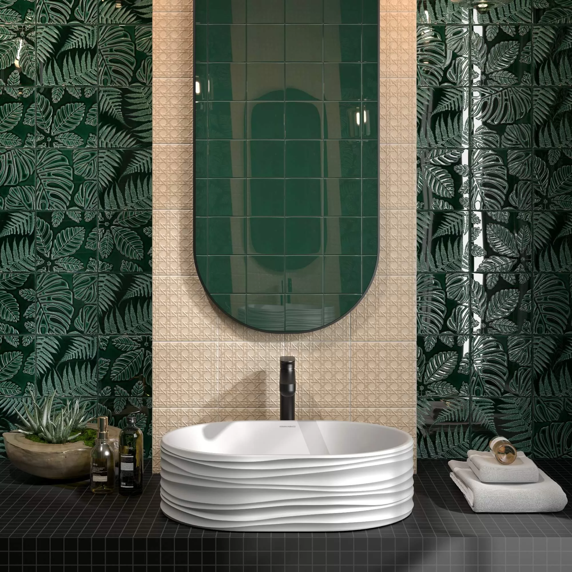 Фрагменты лиан и тропических листьев на стене складываются в удивительный изумрудный ковёр, который можно дополнить тонким бордюром или керамическим багетом «Граньяно». Подобная выкладка также отлично сочетается с деревянными бордюрами и плиткой серии «Навильи» 15×15, воспроизводящей рисунок дерева и ротанговое плетение в популярной стилистике «каннаж».