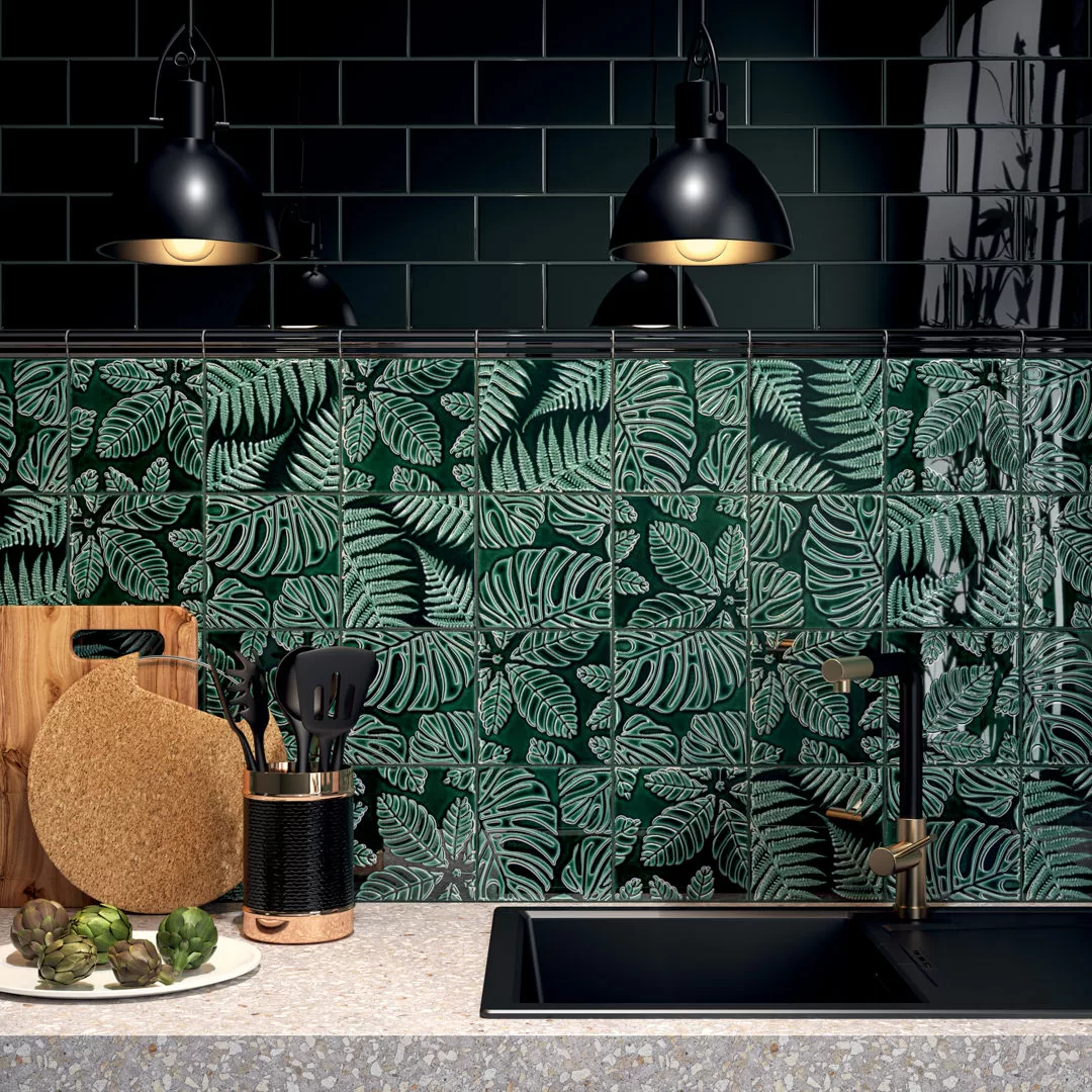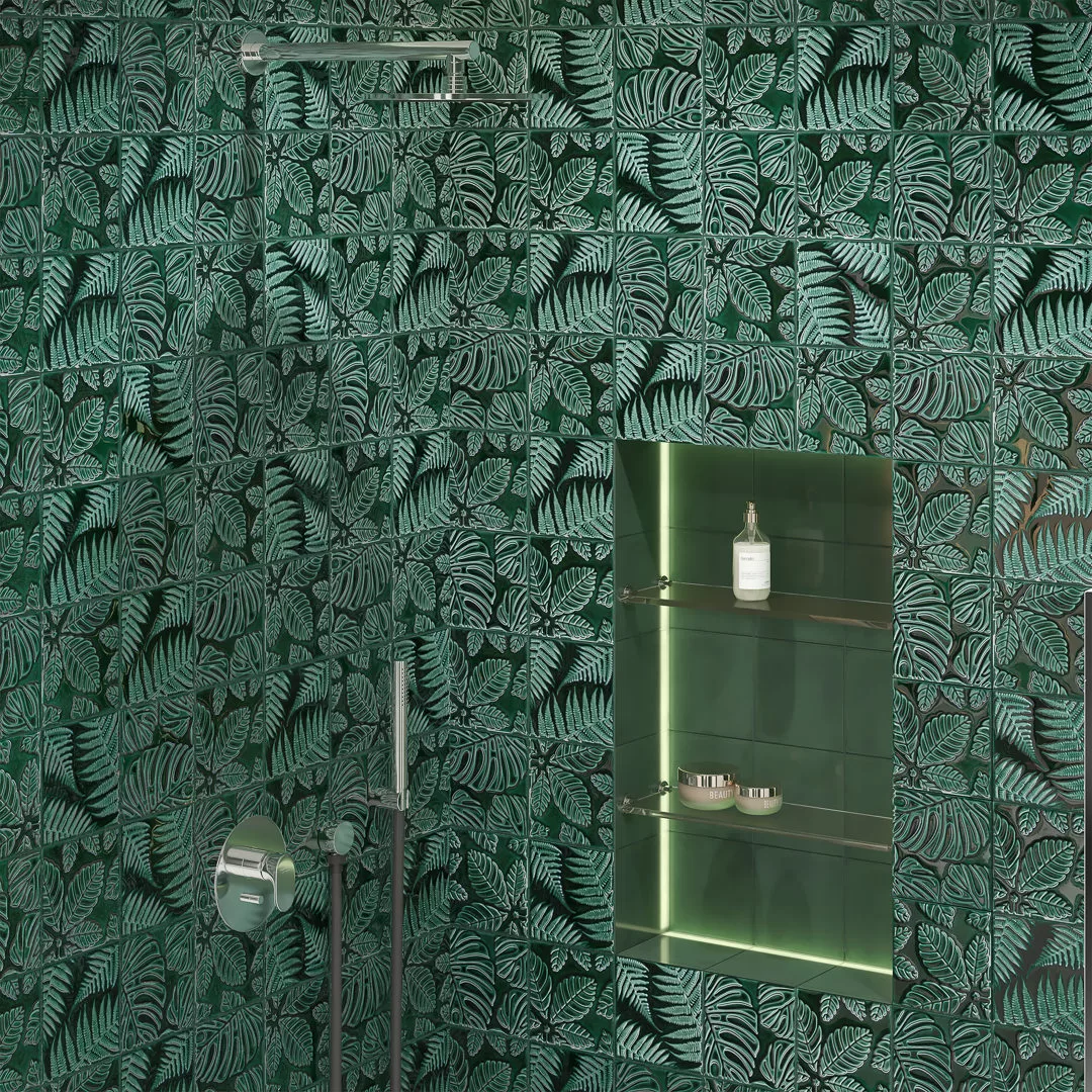 Именно такой пейзаж вдохновил создателей серии «Сантана» на линейку удивительных декоративных элементов, дополненных однотонной тёмно-зелёной плиткой. Тропические мотивы обладают ярко выраженной объёмной структурой. Поверхность декоров покрывает блестящая реактивная глазурь, придающая керамической отделке особую глубину и выразительность.