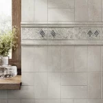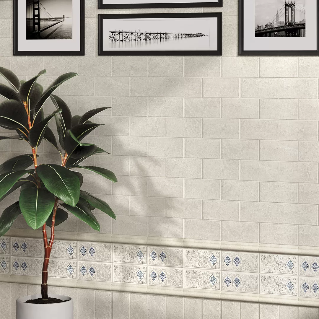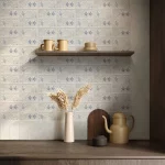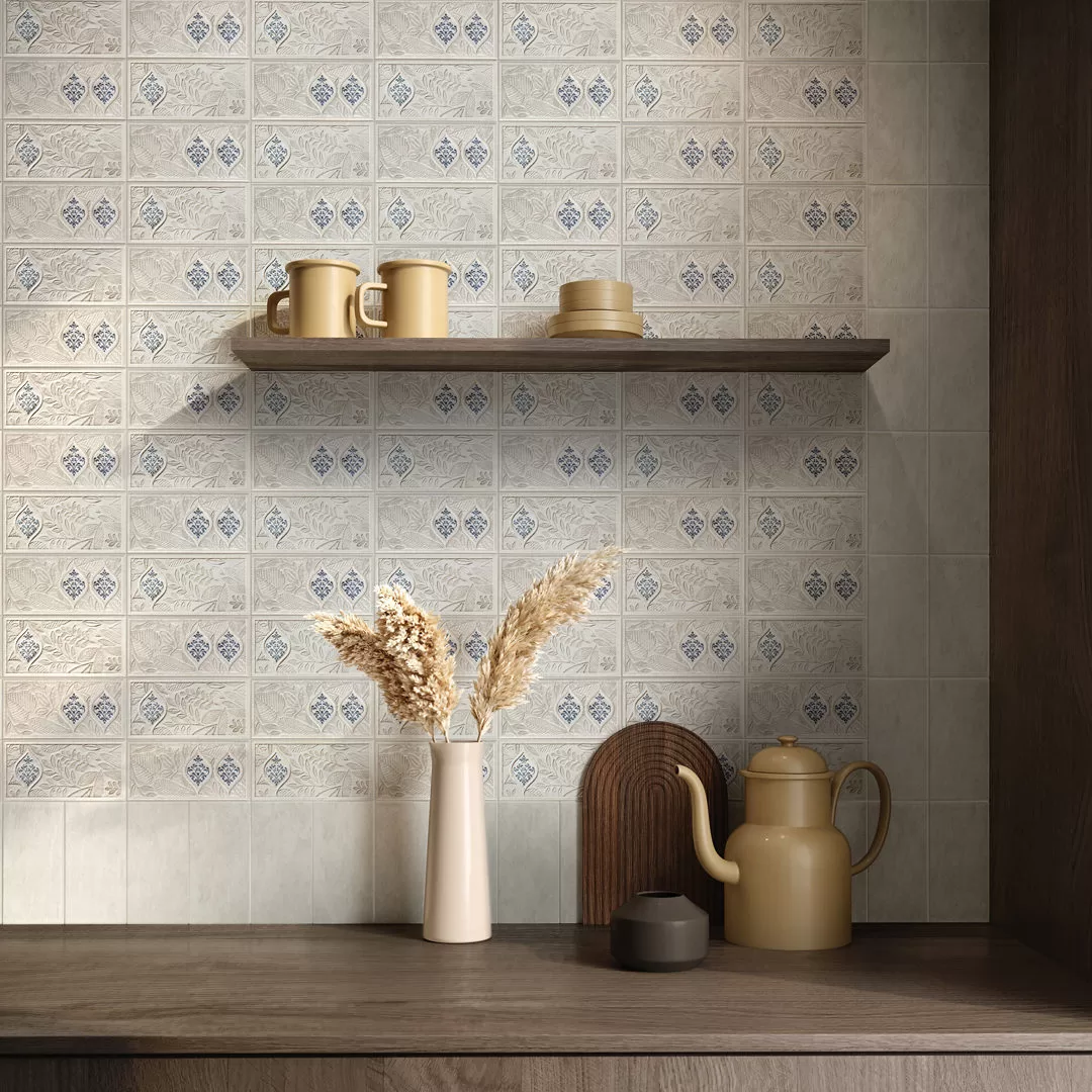 Интересная структура камня в фоновой плитке дополнена эффектом объёма, созданным благодаря исключительно реалистичной цифровой печати. В декорах для стен и пола применено сочетание намеренно простой графики, напоминающей первые рисунки на камне, и майоличной росписи с классическим узором.