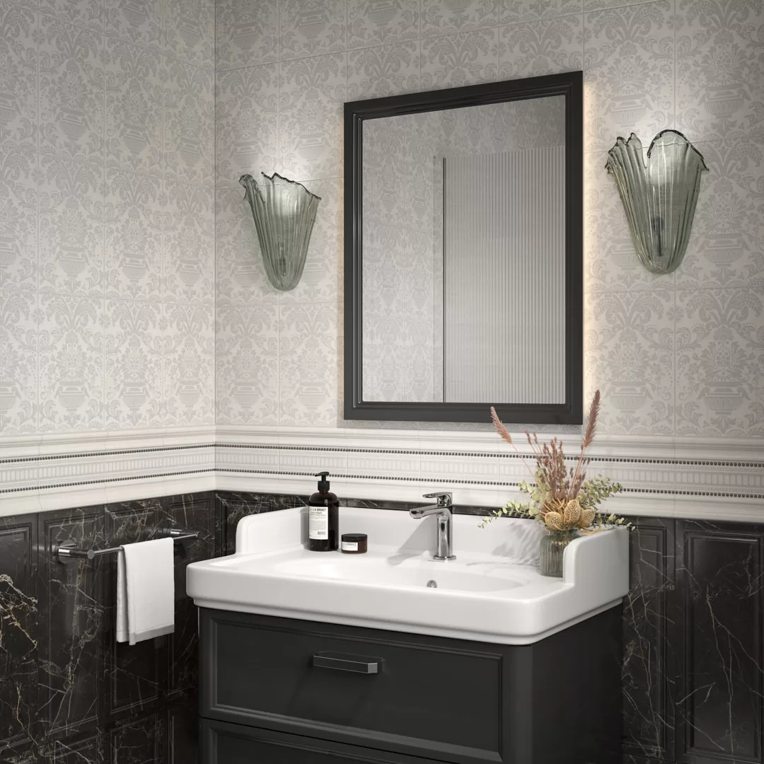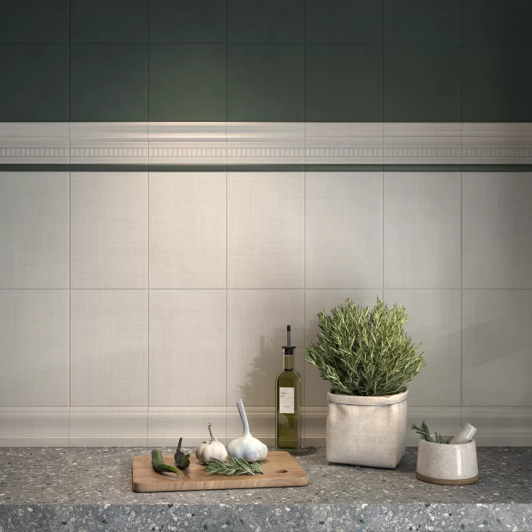 Серая и светло-серая матовая плитка «Спинелли» в фоновом варианте имеет деликатную тканевую фактуру. В серии также представлены декоры, бордюры и плинтус, которые позволяют создавать комплексные интерьерные решения.
