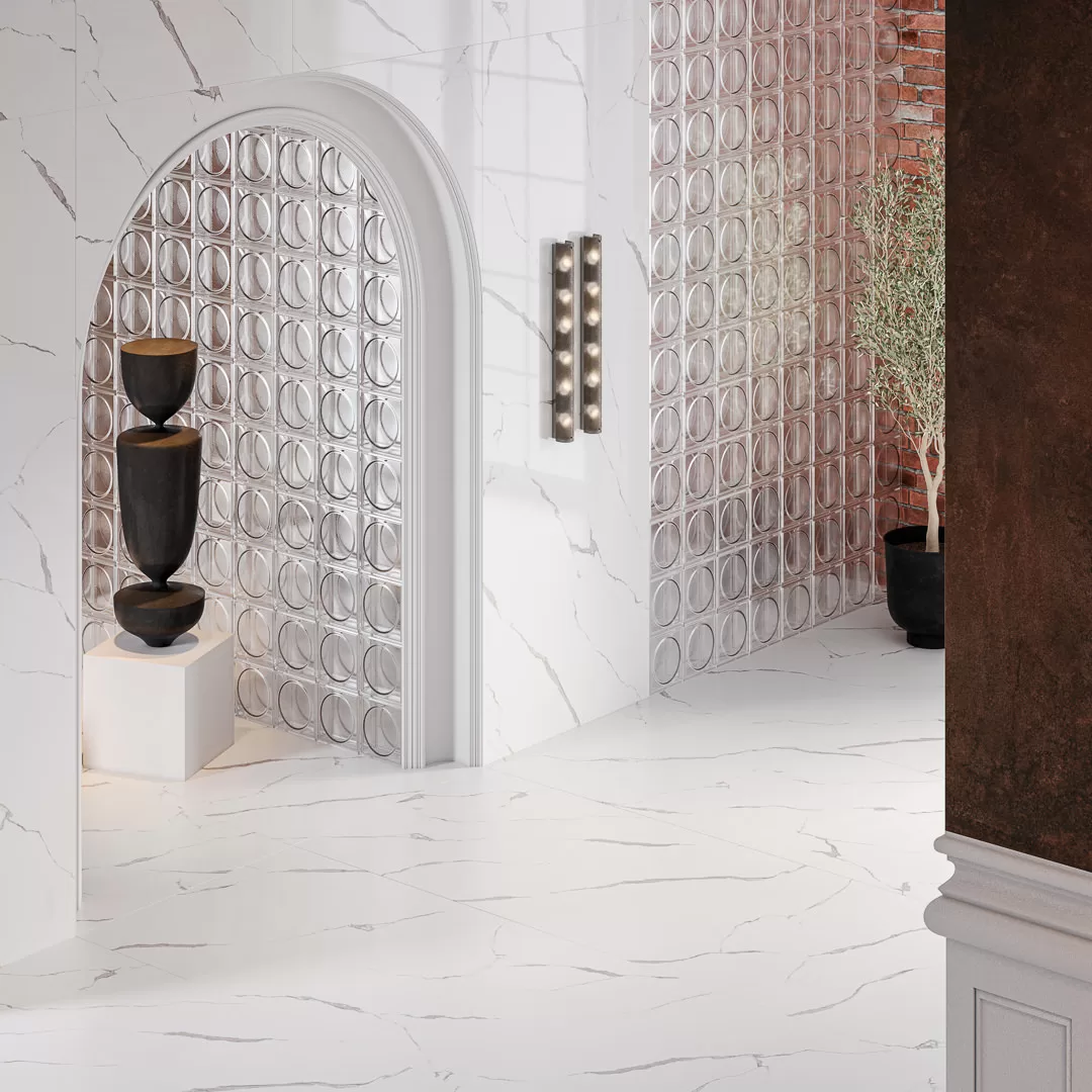 У итальянского белого мрамора «Статуарио» с характерными серыми прожилками — богатая история: ещё в античности из него создавали скульптуры, колонны, чаши для фонтанов и другие архитектурные элементы. Белый отделочный материал с подобным рисунком выглядит аристократично, визуально делая помещения более светлыми и просторными.