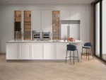 Такая керамическая доска подходит для использования в абсолютно любых интерьерах: частных и общественных, городских и загородных. Формат подходит для всех видов традиционной укладки, в том числе палубной и со смещением. Можно уложить керамогранит ёлочкой, дополнив раскладку фигурным керамическим плинтусом с внутренними и внешними углами, выполненными в тон с настенной плиткой.