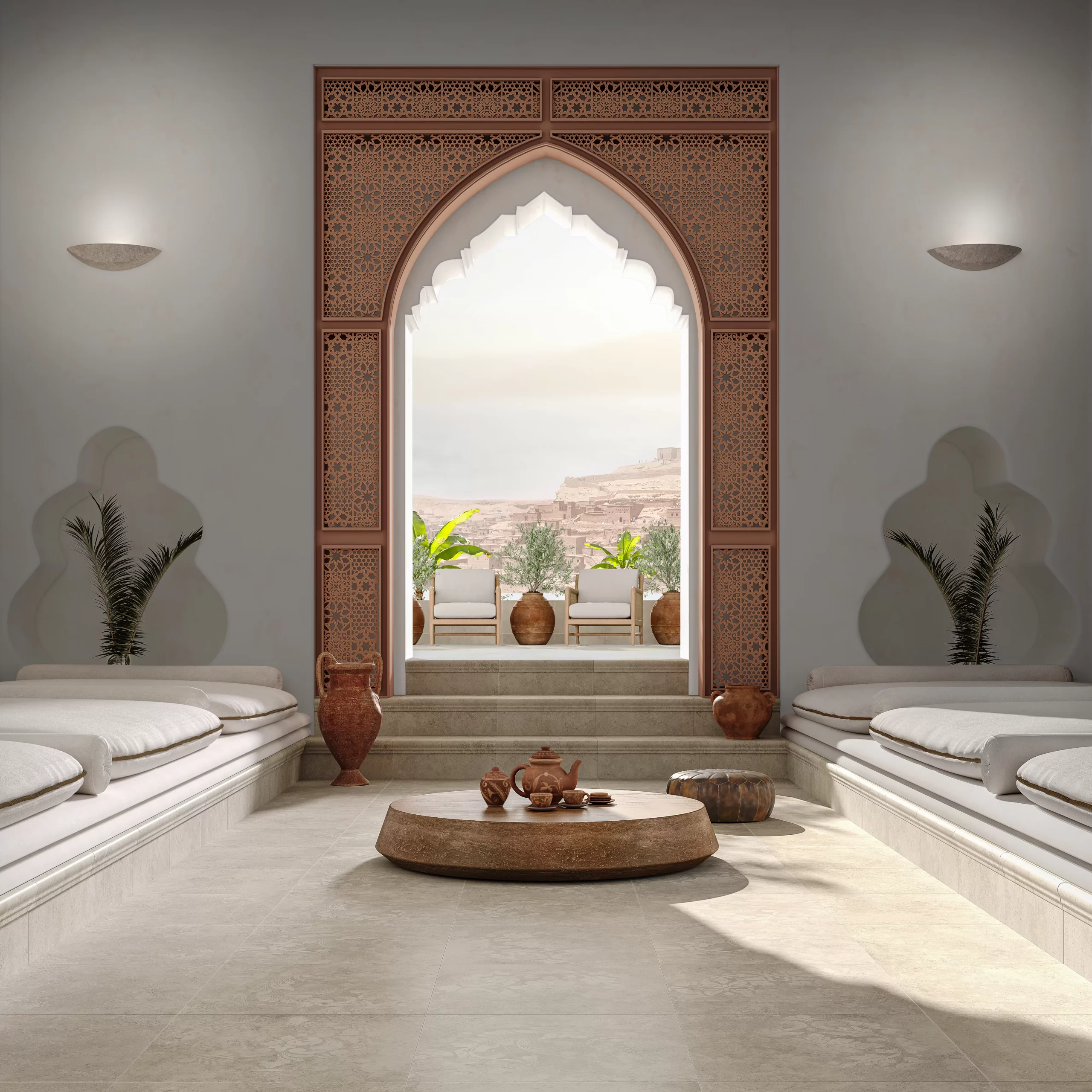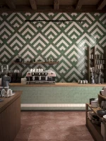 Наряду с цветом красной охры, коричневым и тёмно-серым, гамма серии «Хадду» включает и нейтральные светлые оттенки, подходящие для большинства интерьеров. В качестве варианта фона в каждом из цветовых решений предусмотрен набор квадратной плитки с деликатным орнаментальным узором: едва заметный в текстуре обожжённой глины, он придаёт отделке особую ценность.