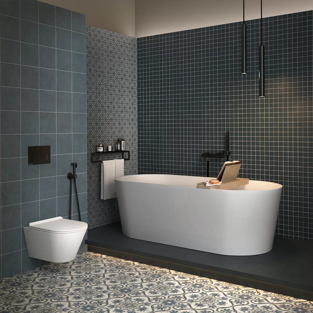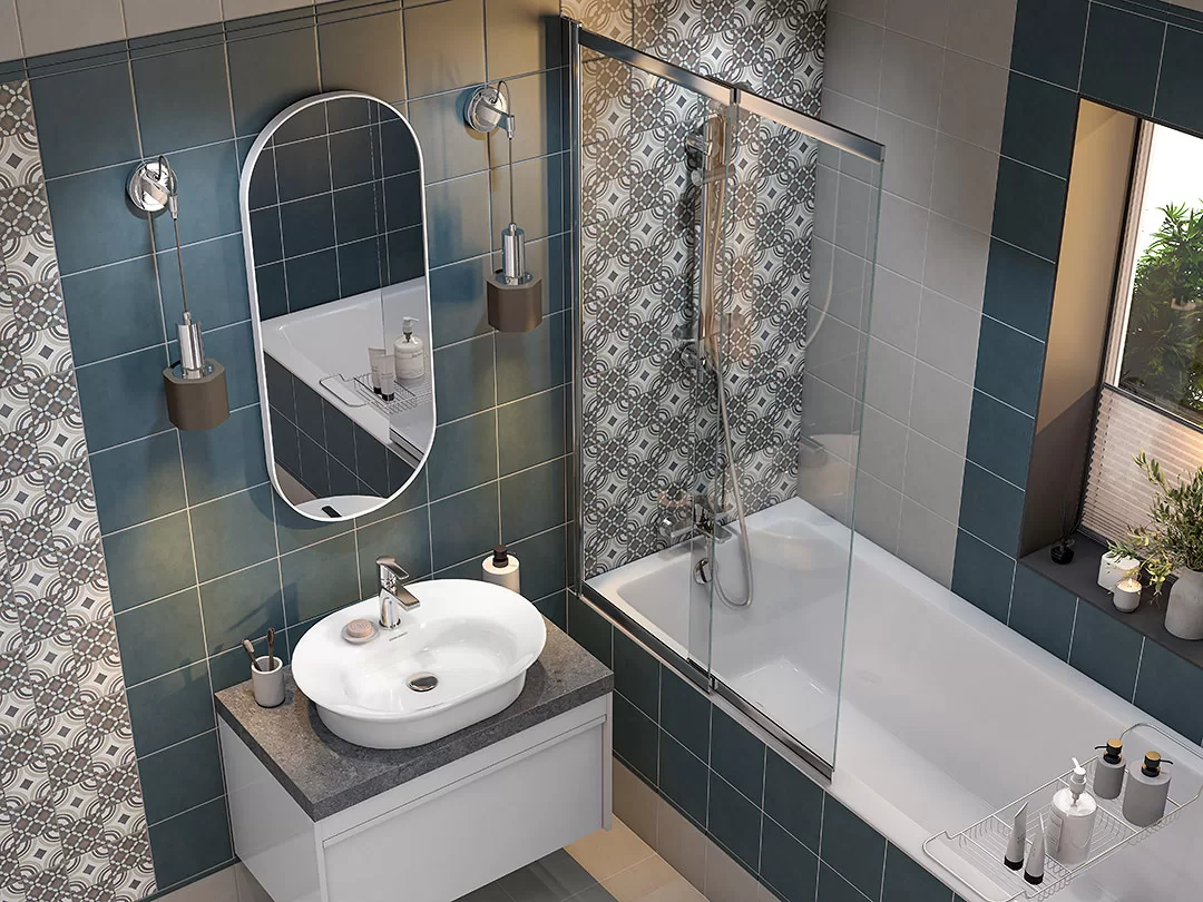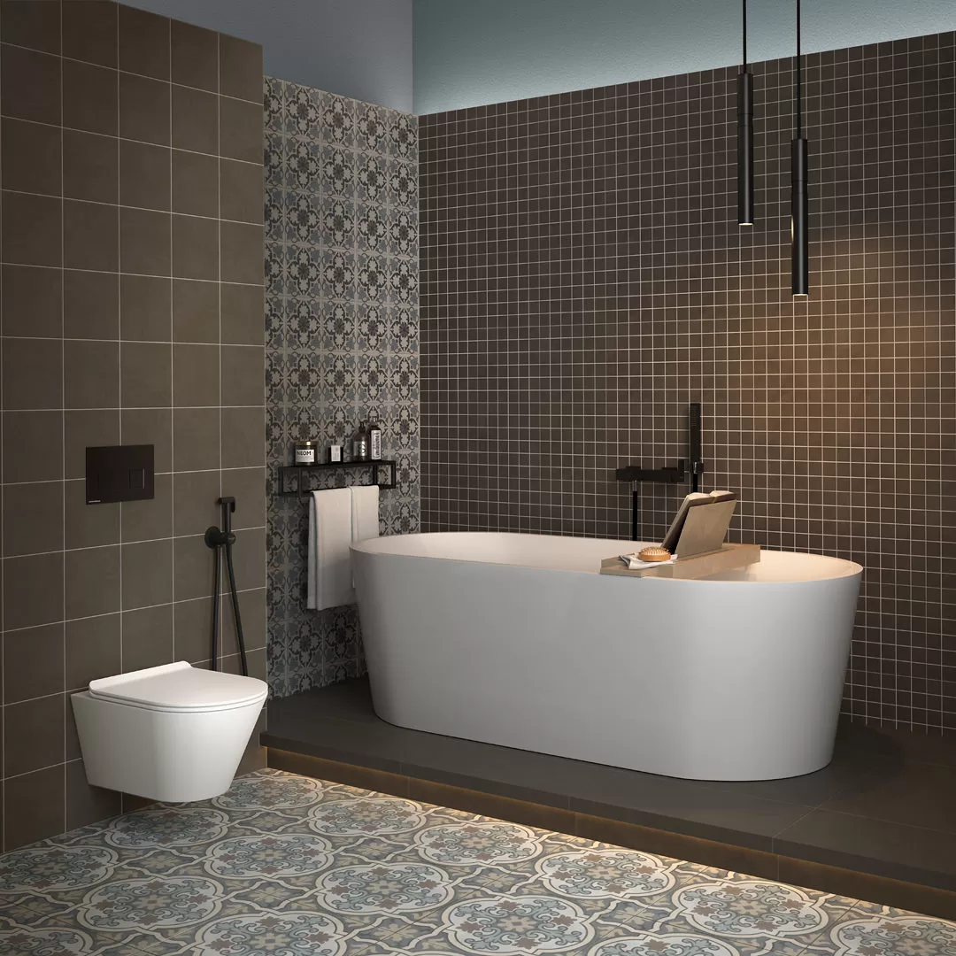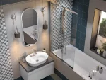 В серии представлены два варианта декоров. Геометрический узор в формате 30×60 содержит все цвета фоновой плитки. Он не только станет заметным акцентом, но и объединит гамму интерьера в стройный ансамбль. А вот декоративная плитка 20×20 см выполнена в технике «пэчворк». Для составления композиции можно выбрать один вид декора или использовать раскладку из нескольких элементов.