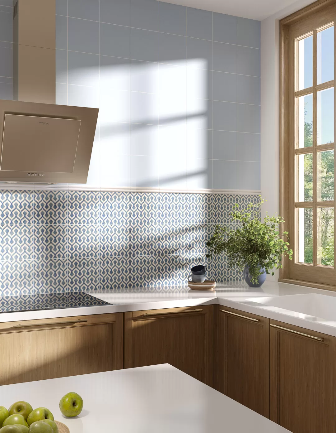 В цветовой гамме серии «Шавен» оттенки лазурного соседствуют с несколькими другими цветами, в том числе белым и бирюзовым. Это позволяет успешно использовать такие декоративные элементы в раскладках с моноколорами «Калейдоскоп» формата 20×20. Белый матовый состав, нанесённый на поверхность плитки, придаёт орнаментальному рисунку объём и делает графику серии выразительнее.