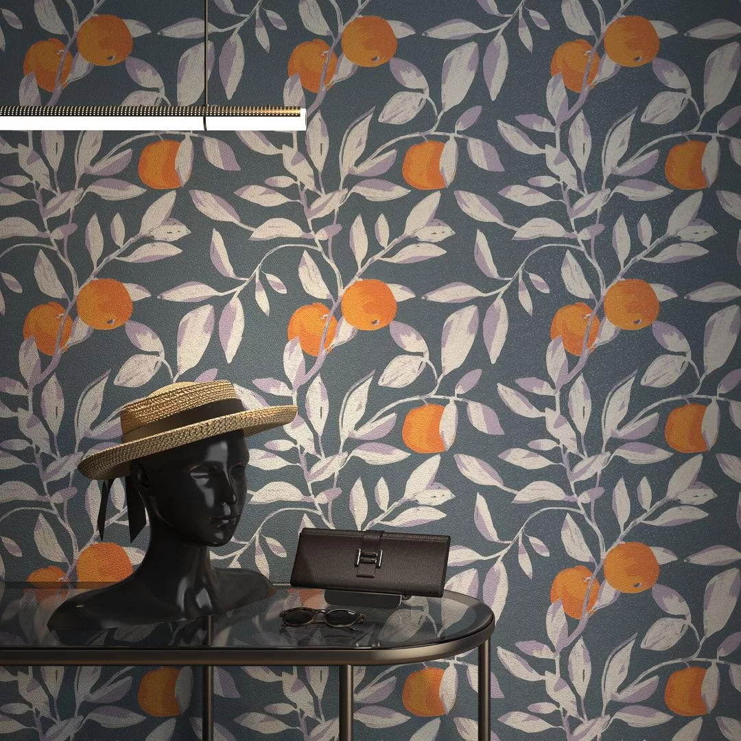 Обои виниловые на флизелиновой основе Шафран мотив, синий, апельсины