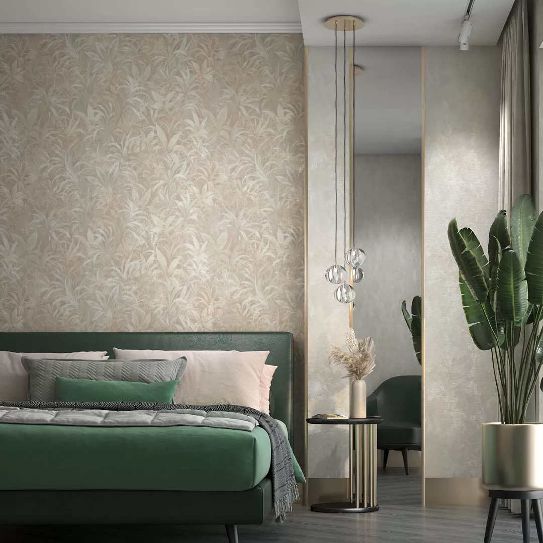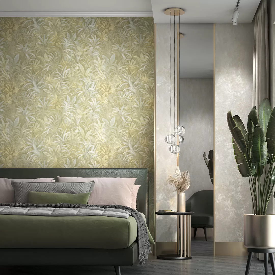 Экзотическая листва словно нарисована пастельными мелками на холсте с деликатным тиснением. Можно предпочесть более тёмный вариант мотива — или тот, который выполнен на светлом фоне.