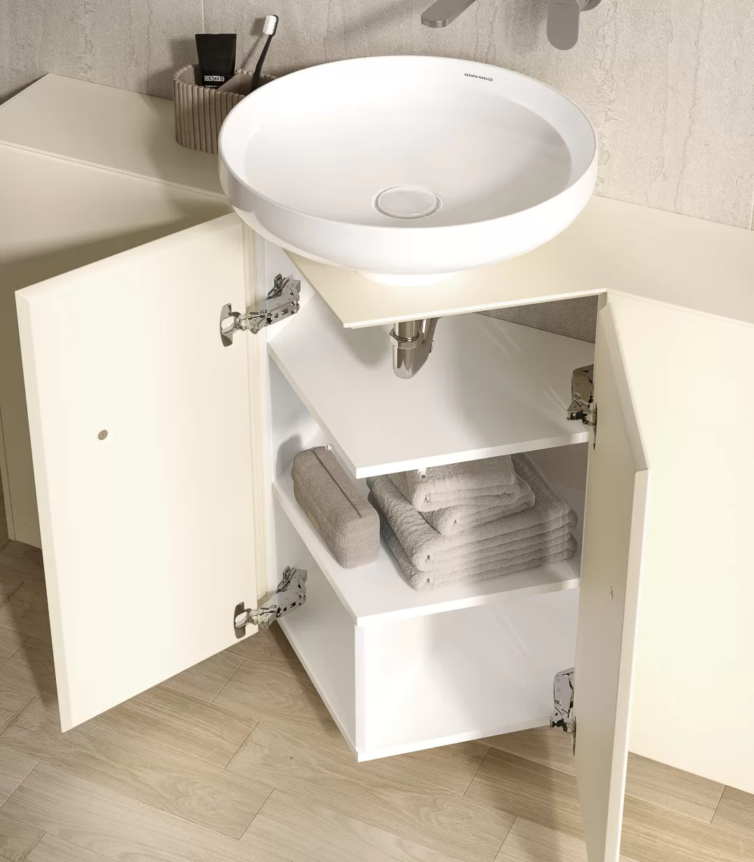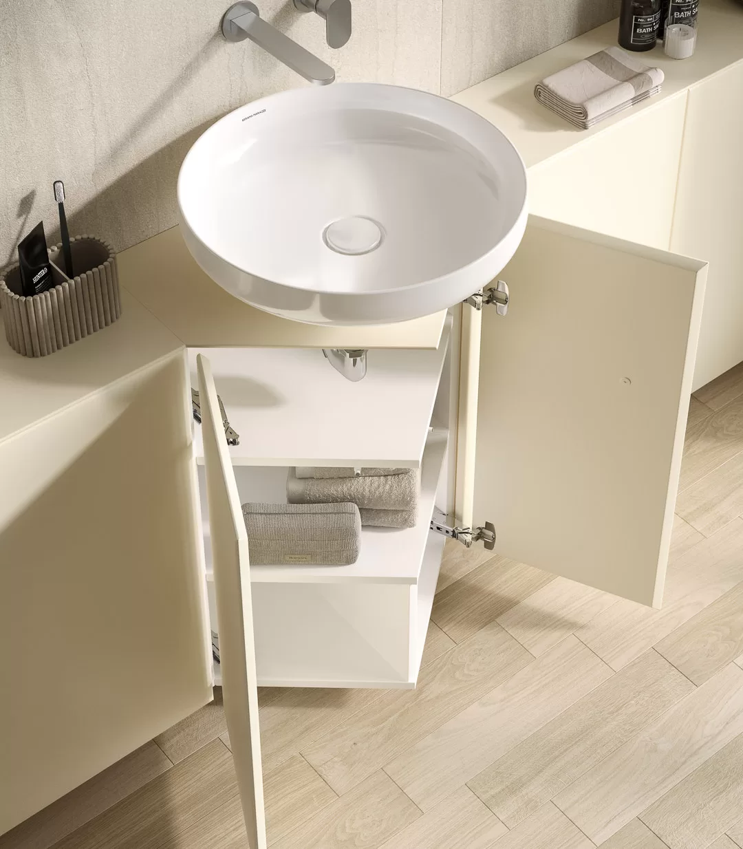 Контуры мебельных модулей, составленных вместе, напоминают очертания мозаичных звёзд в основании марокканских фонтанов. В серии CARAVAN предусмотрено два вида подвесных модулей: один — для хранения, второй, с острым углом — для установки раковины или хранения (в последнем случае будет использована столешница без отверстия). Модуль для хранения можно использовать и как подвесной пенал.