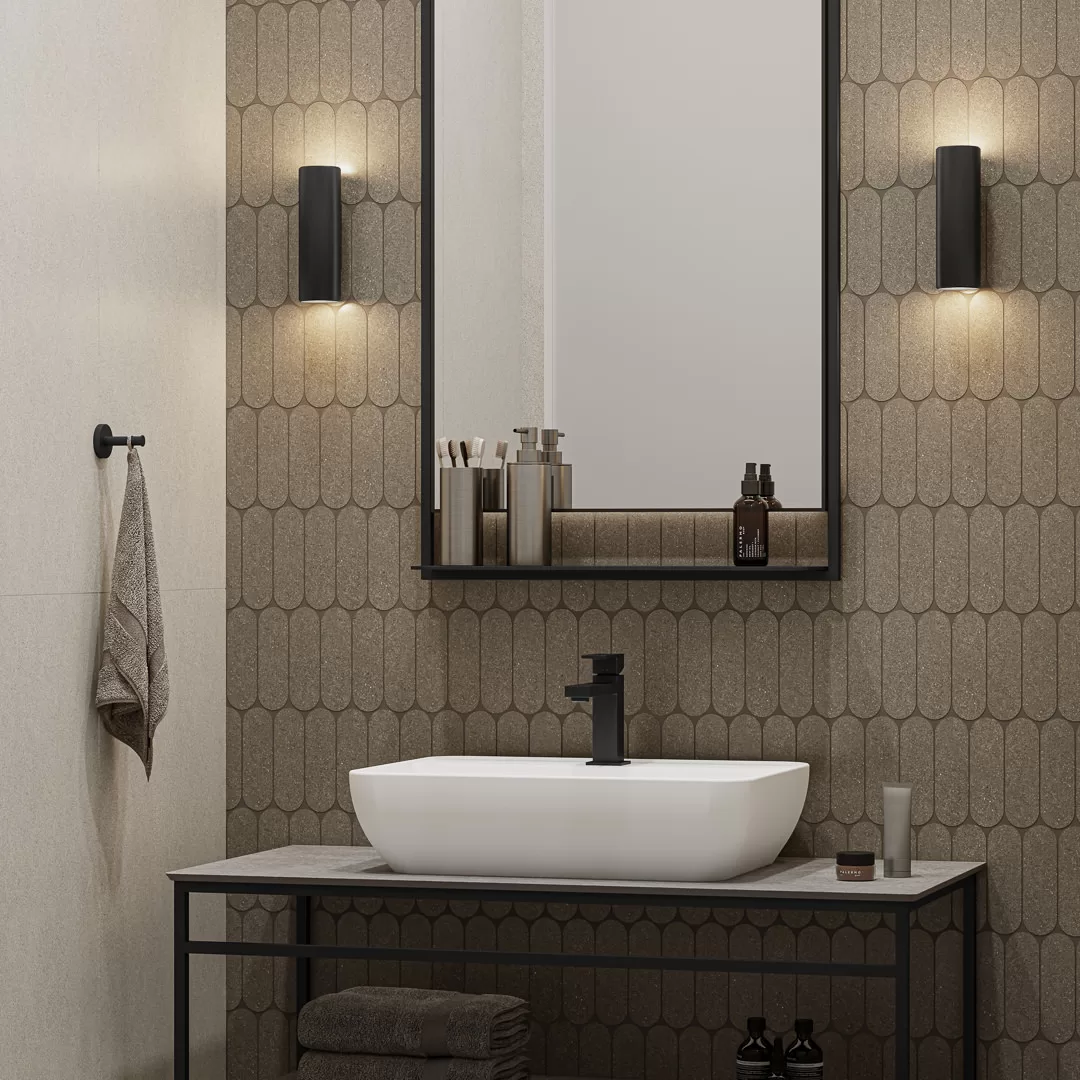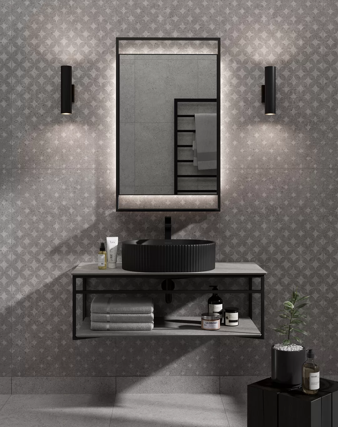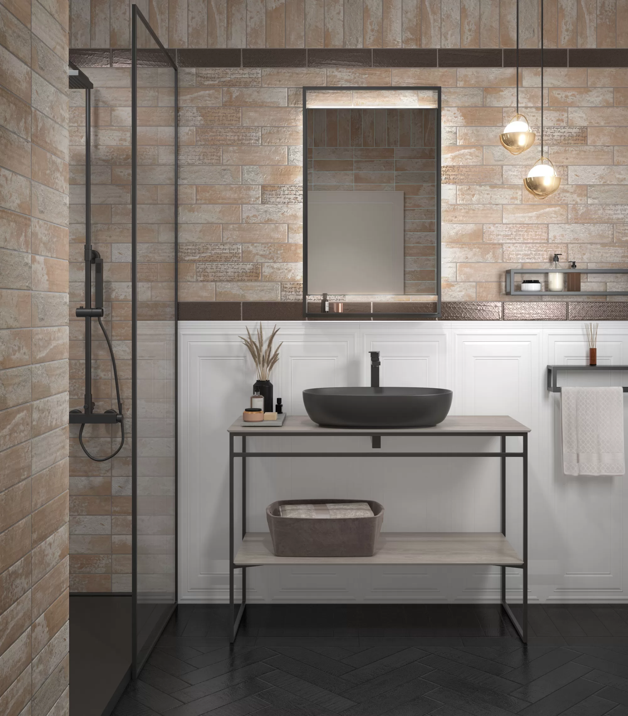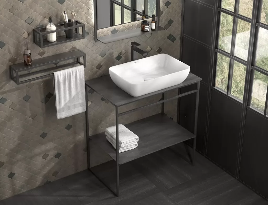 Серия PLAZA NEXT, элементы которой выполнены из металла, — органичное решение для ванной комнаты в стиле лофт. Напольные и подвесные тумбы PLAZA NEXT с их стильными структурами из чёрного окрашенного металла и столешницами, воспроизводящими кортеновскую сталь с реалистичным эффектом коррозии или камень, специально созданы для смелых брутальных интерьеров. Матовый каркас помимо керамической столешницы имеет керамическую полку для аксессуаров и мелочей. Завершить комбинацию «тумба + раковина + столешница» поможет накладная или встраиваемая сверху раковина PLAZA. Отличными компаньонами к тумбе станут зеркало PLAZA NEXT с каркасом из металлического профиля, вдоль которого проведена скрытая LED-подсветка с сенсорным выключателем и лёгкие подвесные полки двух размеров.