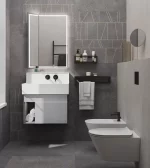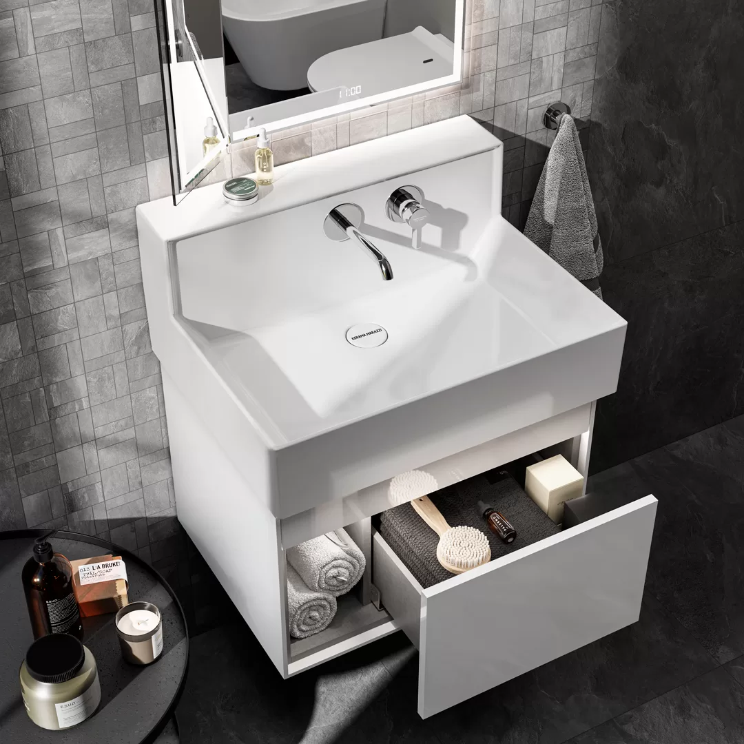 Комплект TECNOLOGICA M готов стать ключевым элементом ванной комнаты, объединив в себе функциональность, запоминающийся облик и яркие инновации. При ширине 65 см это решение содержит всё необходимое для повседневной заботы о красоте и здоровье. Комплект, состоящий из зеркала, тумбы и раковины со встроенным смесителем, предлагает особый потребительский опыт — и напоминает о том, что пришло время менять ежедневные привычки к лучшему.