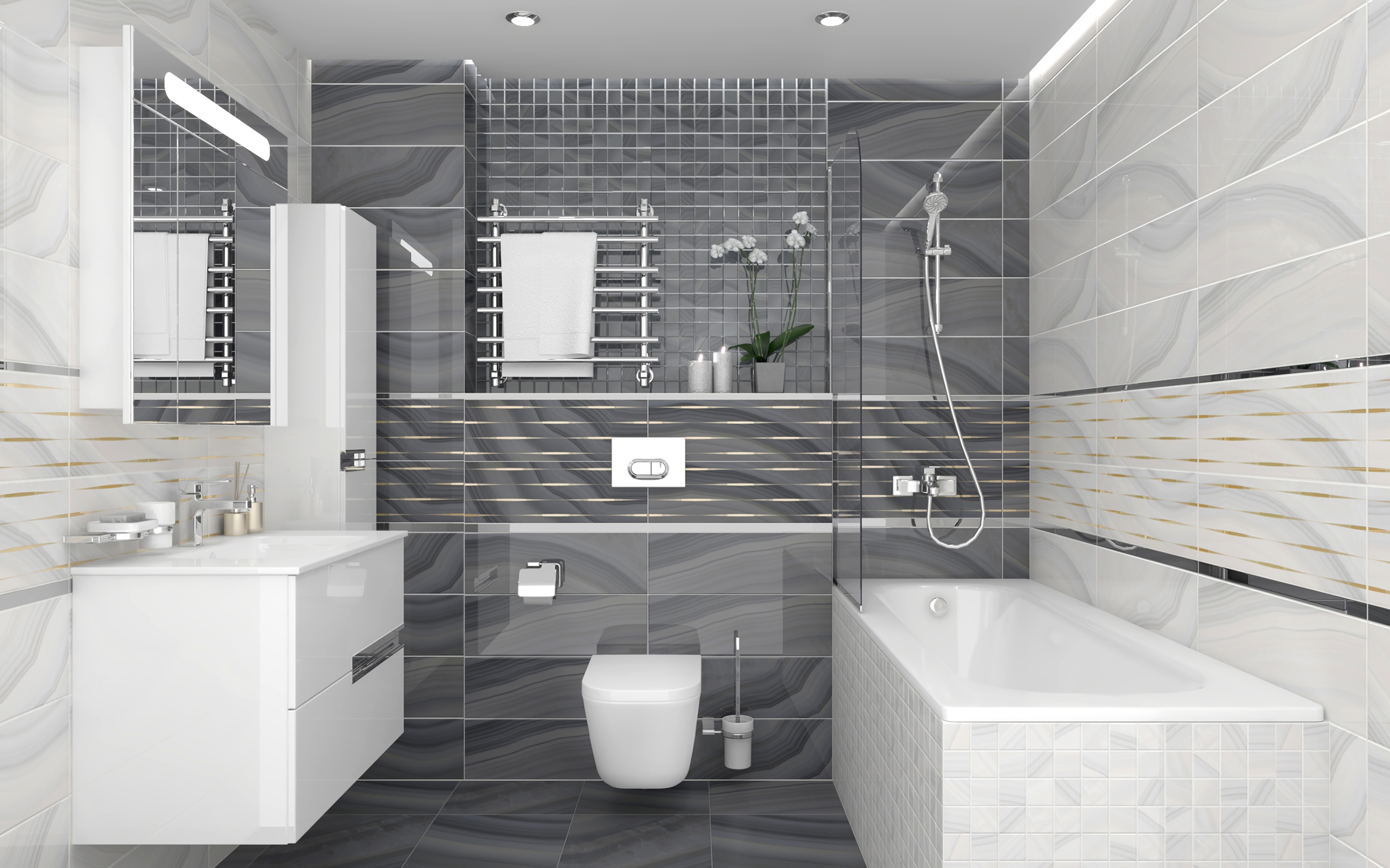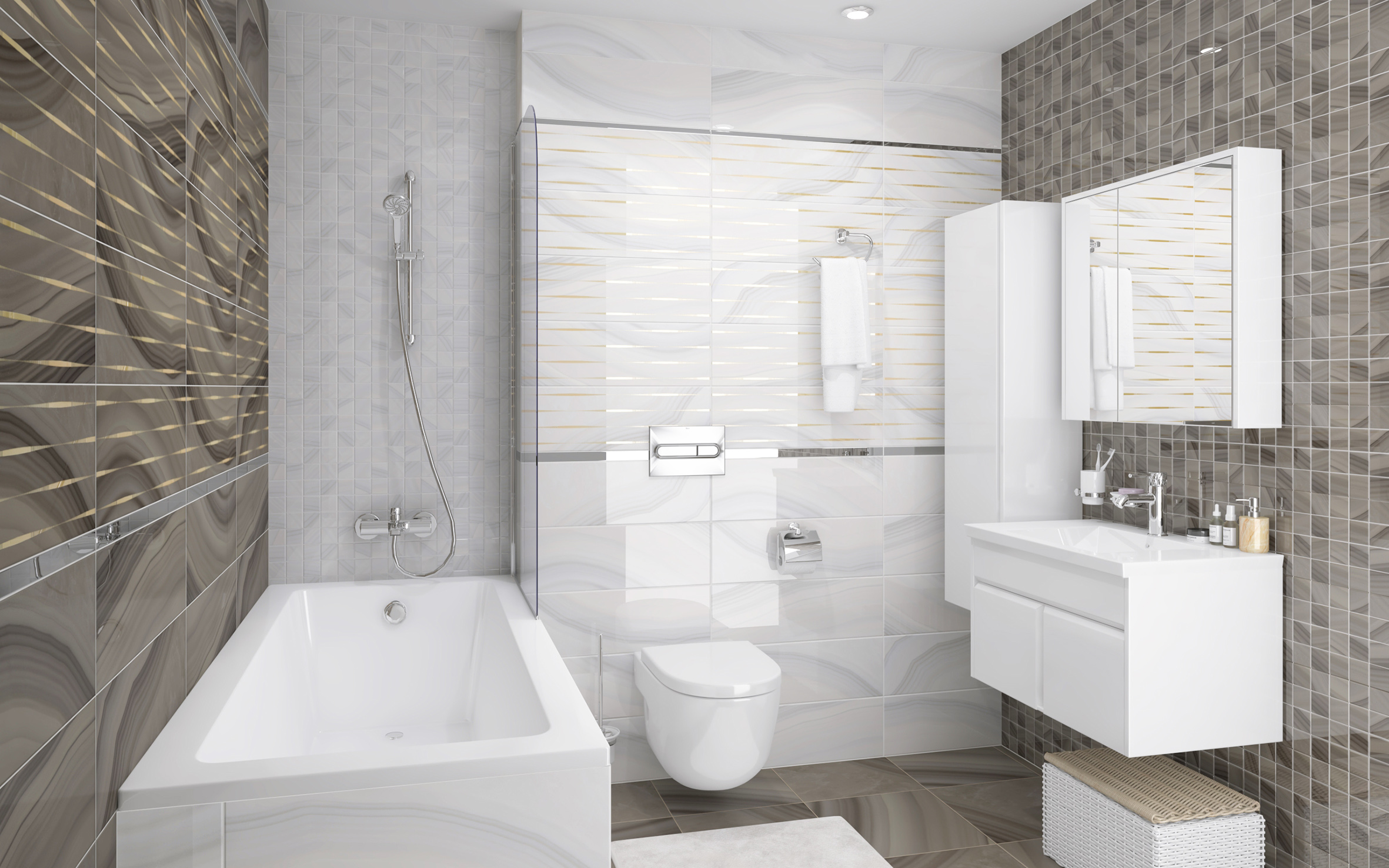 Как легко догадаться по названию, коллекция Agat воспроизводит рисунок агата. На керамической плитке изображены завораживающие своей красотой слои минерала с плавными переходами оттенков. Настенная плитка представлена в трёх утончённых цветах – кофейном, светлом и сером. Агат не требует броских украшений, поэтому декоры только добавляют необходимые акценты. Псевдомозаика представляет собой разнонаправленные слои минерала. Декор Lines с контрастными линиями добавит ритмичность и динамику в интерьер. Модуль Geo покрыт геометрическим орнаментом в шахматном стиле, но вместо чёрно-белых квадратов на плитке изображены ромбы с рисунком агата и полосатым узором.