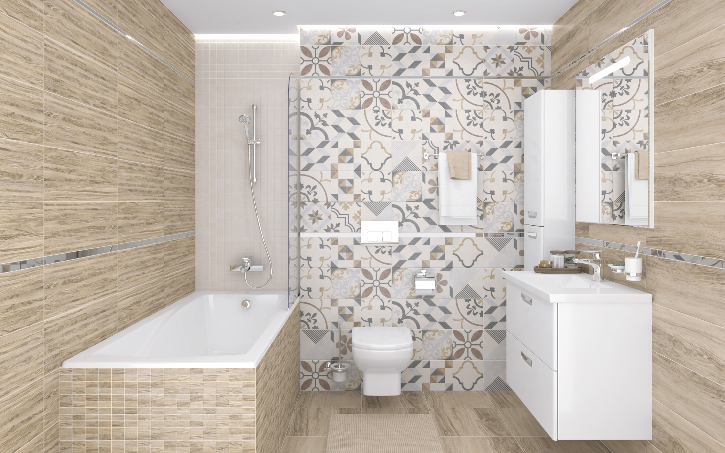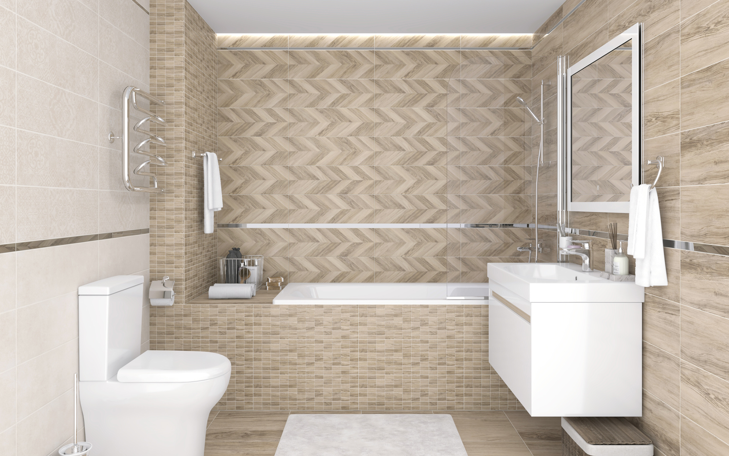 Коллекция Amber выполнена как имитация древесины в природном бежевом цвете. Это прекрасный вариант для оформления интерьера в экостиле. Базовая настенная плитка представлена двумя очень интересными модулями. Одна плитка имеет матовую фактуру, а если провести рукой по второй, то можно почувствовать рельефные древесные волокна. Плитка с укладкой плашек «ёлочкой” создаст интересное разнообразие форм дощечек. Мозаичный декор воспроизводит горизонтально уложенную плитку «кабанчик». Панно из шести элементов покрыто традиционными геометрическими узорами.