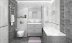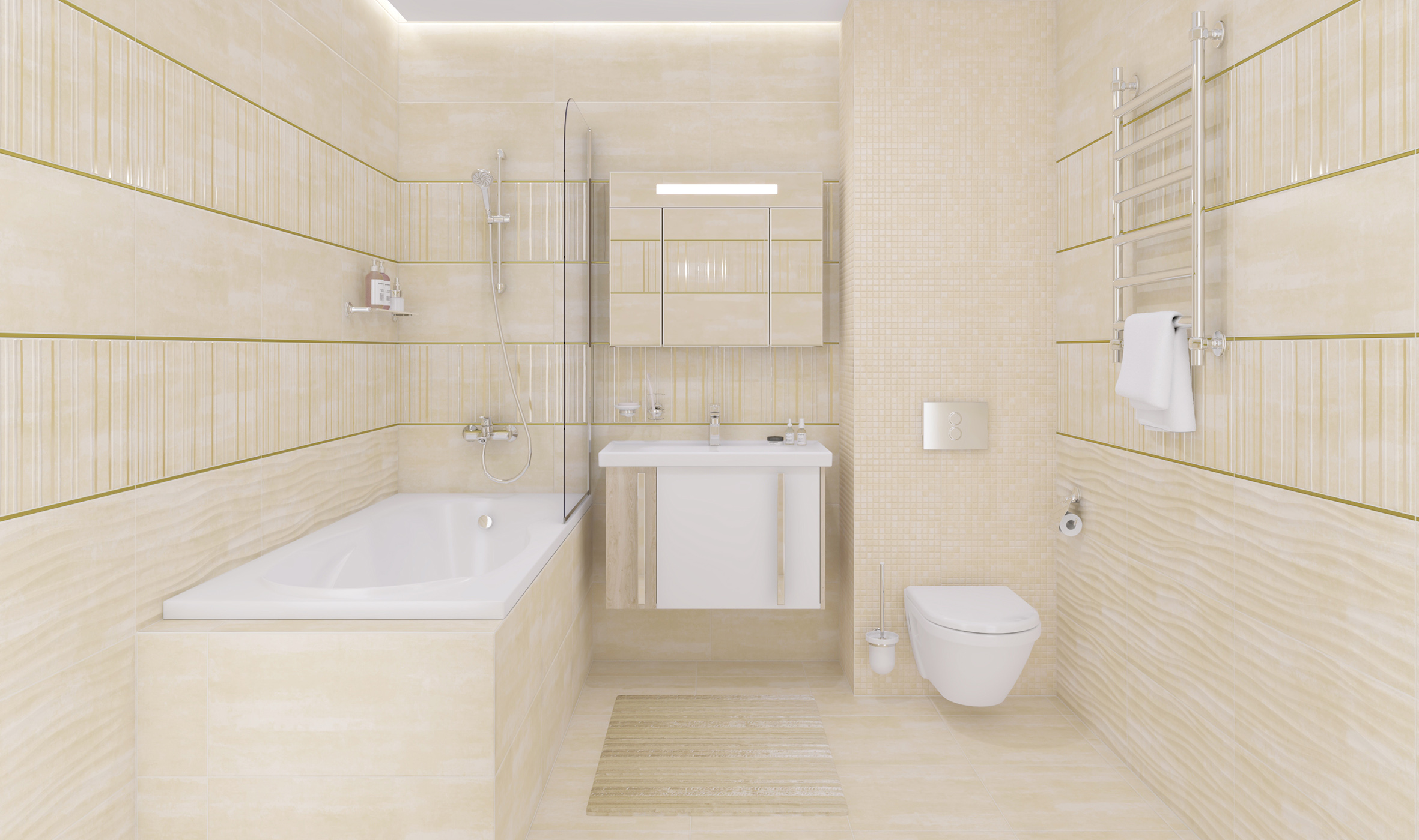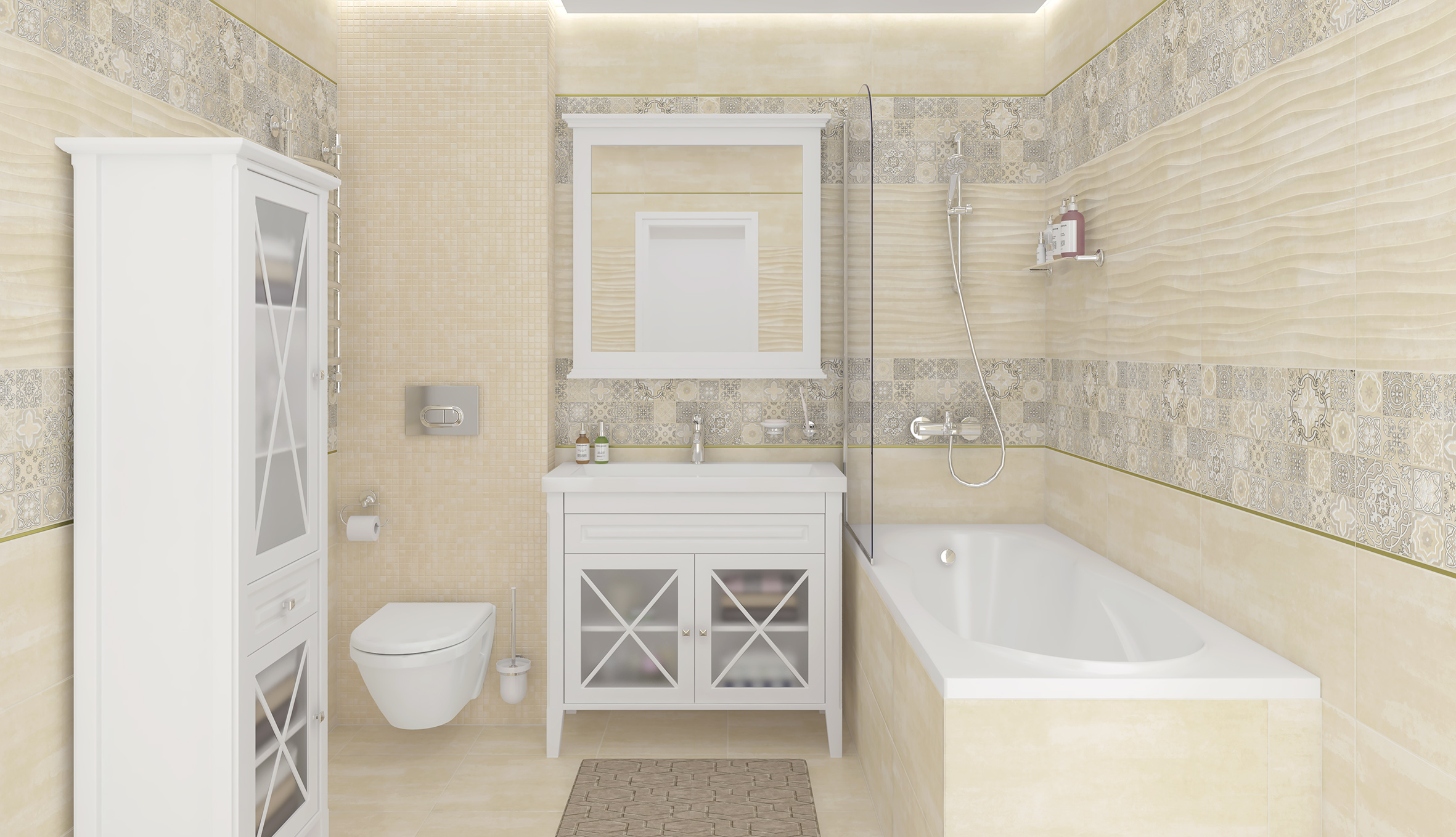 Коллекция Concrete выполнена в урбанистическом стиле. Плитка имитирует гладко оштукатуренный бетон в сером, тёмно-сером и бежевом цвете. Базовая настенная и напольная плитка имеет несколько разных “лиц”. Для разбавления гладкой матовой текстуры используете модуль с рельефным волнообразным рисунком. Поверхности будут по-разному отражать свет, создавая необычные отблески. Декор Vimp в стиле пэчворк станет главным акцентом интерьера. Модуль Trigger покрыт блестящими рельефными полосами из тугоплавкой ветрозы. Его дополнит золотистый металлизированный бордюр. Классическая псевдомозаика поможет зонировать отдельные участки ванной комнаты.