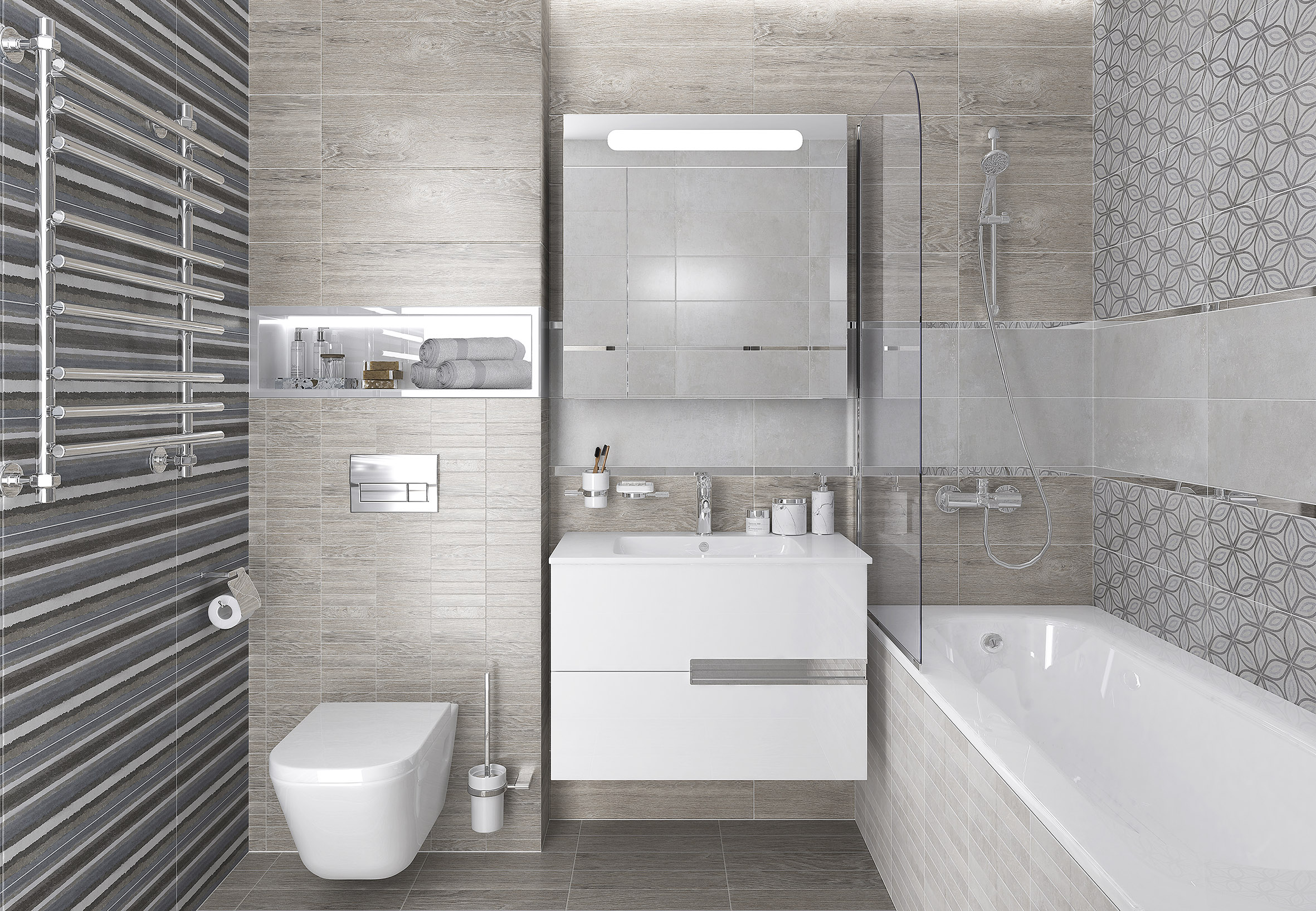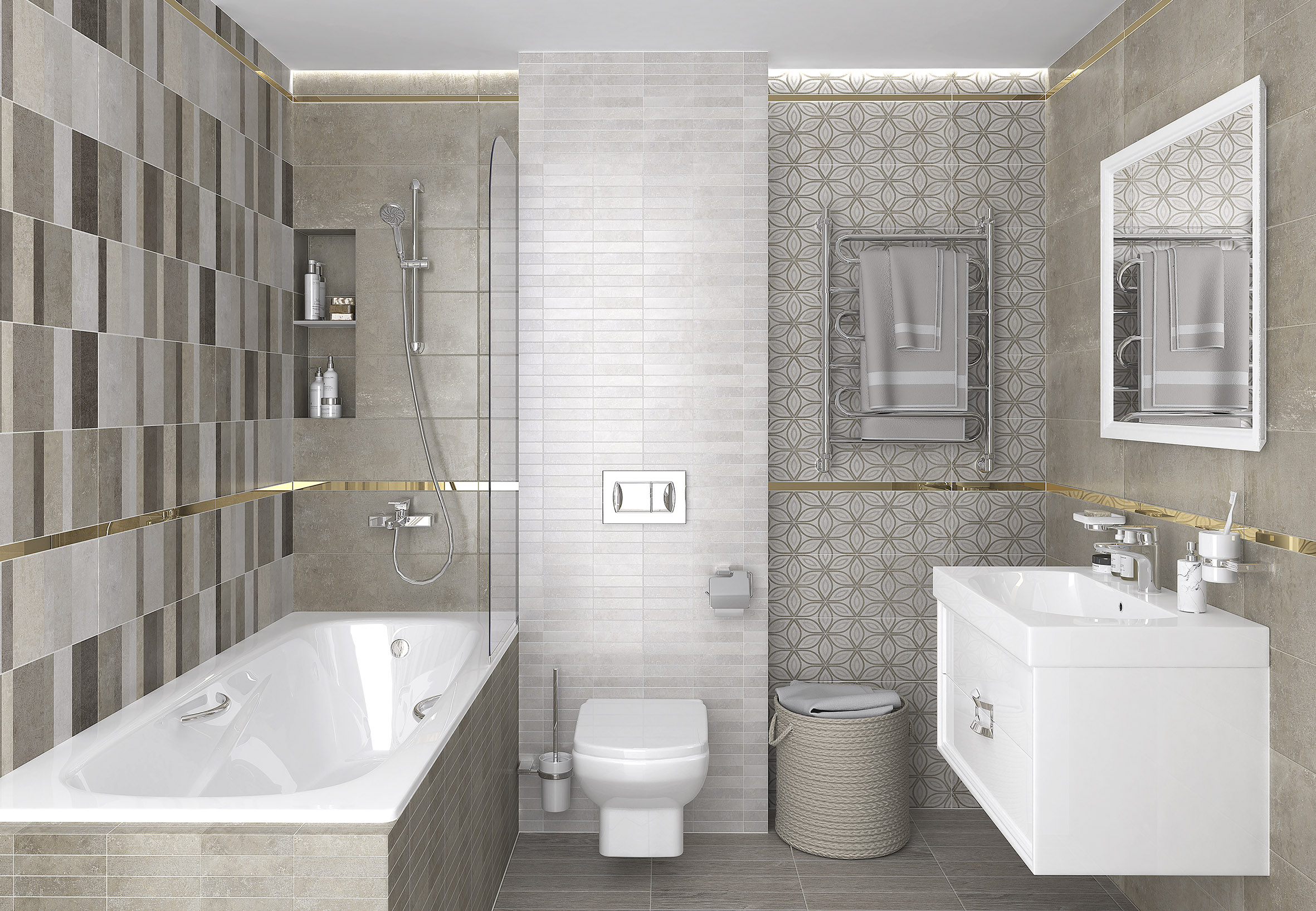 Четыре цвета, но характеров интерьера можно создать неизмеримо больше! Сочетайте базовую плитку с мозаичными и геометрическими декофонами так, как нравится только вам. Создавайте панно, акцентные зоны или целые стены! Если вы предпочитаете последовательность, остановитесь на чем-то одном, если творческая личность — сделайте ванную синонимичной своей душе и настроению. Она может стать бриллиантом, у которого не найдется ни одной повторяющейся грани!