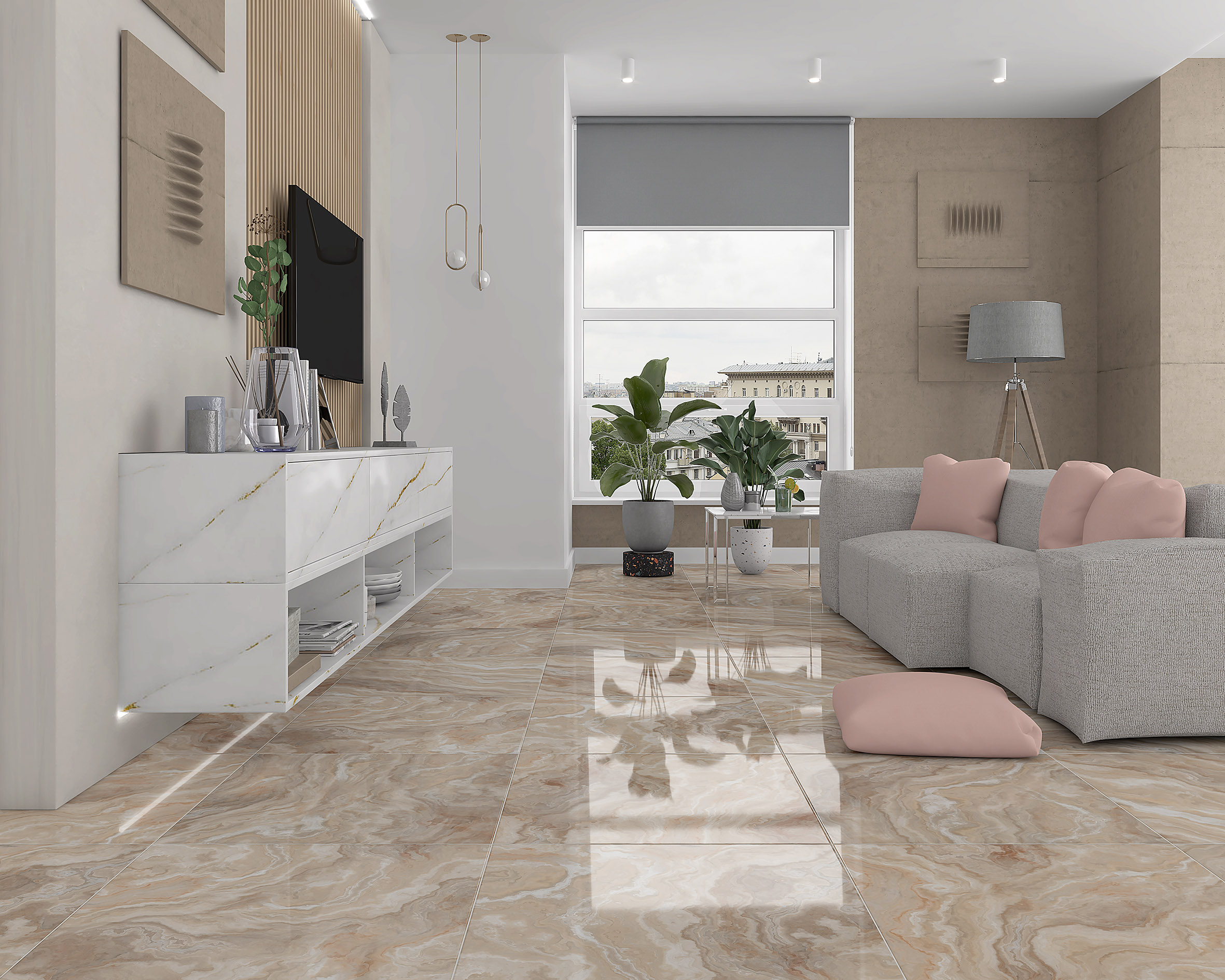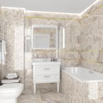 Бежевый керамогранит от Laparet представлен в приятной пастельной гамме и имитирует натуральный камень агат в уникальном орнаменте в серии Crema. Слегка расплывчатый рисунок универсален для ванной комнаты, а керамическая плитка отлично сочетается с любой мебелью и сантехникой. Рисунок агата интересно выглядит в интерьер, наполняя уютом комнату за счет теплой гаммы цветов. Кремовый керамогранит под агат можно сочетать с элементами в золотой окраске, что придает интерьеру некоторую роскошь. Известный бренд Laparet разработал плитку серии Crema во всех элементах, необходимых для отделки ванной: