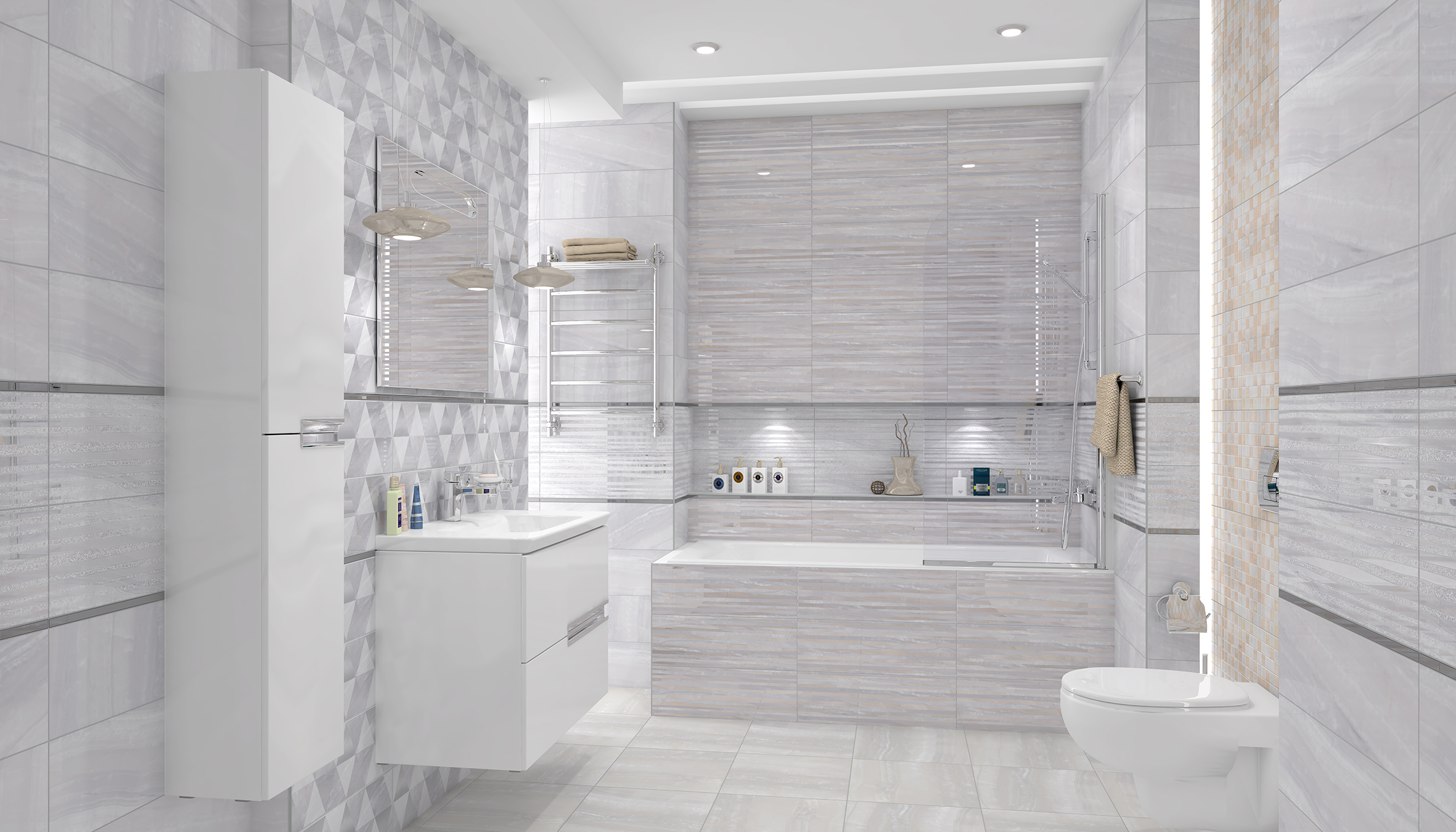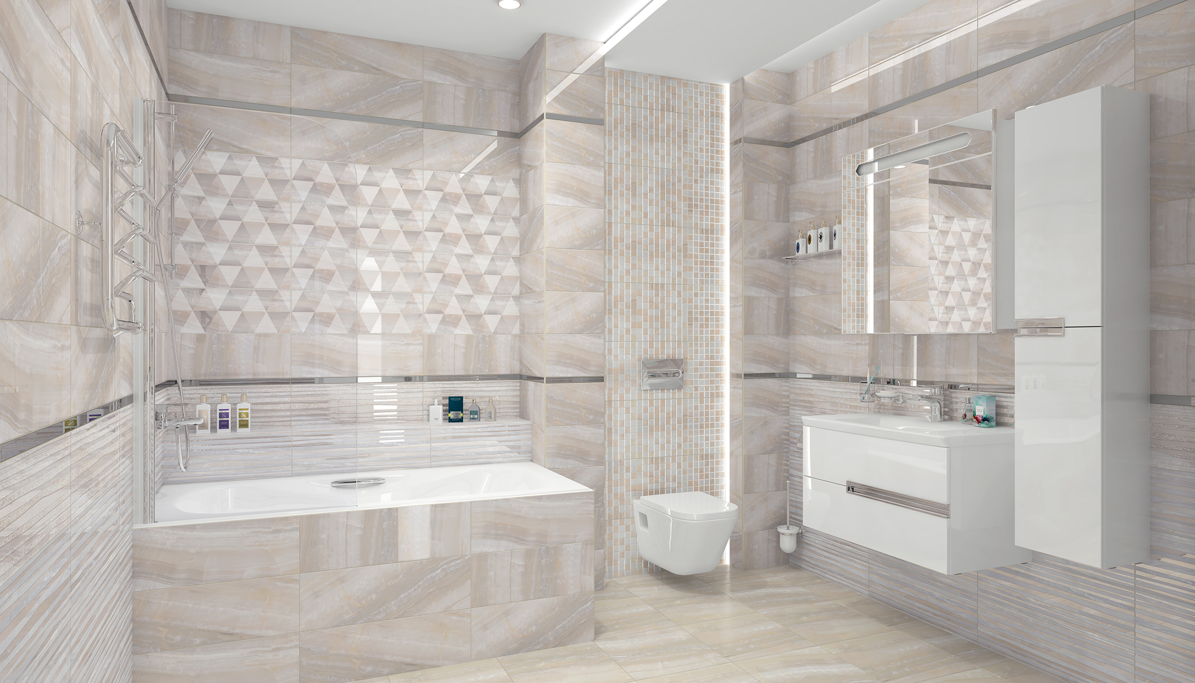 Коллекция Diadema – венец, украшенный драгоценными камнями и жемчужинами. Керамическая плитка воспроизводит восхитительную текстуру оникса. На слои горной породы можно смотреть бесконечно и поражаться их красотой. Настенная плитка и керамогранит выполнены в тёплых палитрах из белого, голубого и бежевого цветов. Рельефный модуль с ярко выраженными слоями по-другому отражает свет, наполняя комнату волшебными отблесками. Декоры коллекции изящные и элегантные. Модуль Perla передаёт плавные переливы оттенков жемчуга. Декор Fly отличается воздушностью изображения. Обязательный компонент интерьера ванной комнаты – псевдомозаика в бело-бежевой и бело-голубой палитре.