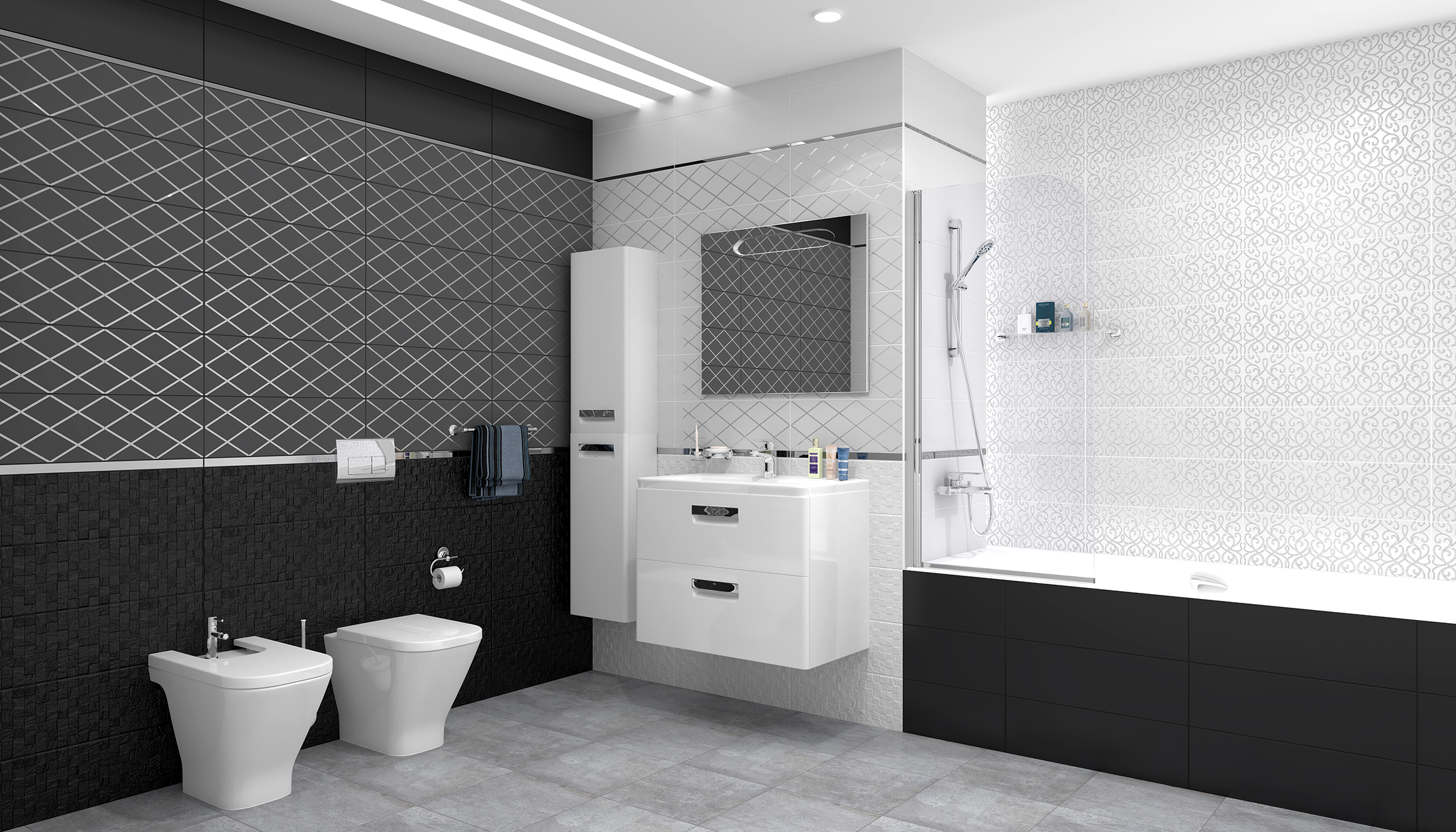 Совершенное монохромное сочетание раскрывается в коллекции Eridan. Основа коллекции – однотонная чёрная и белая настенная плитка. Декоративные модули создают разные по стилю решения: Blast с ажурным узором добавит нотку романтики, ромбовидная сетка Attimo привнесёт иллюзию постоянного движения. Контуры узоров обработаны тугоплавкой блестящей эмалью, придающей им объём. Серебристый бордюр маленького формата 0,8х60 имеет матовую поверхность.