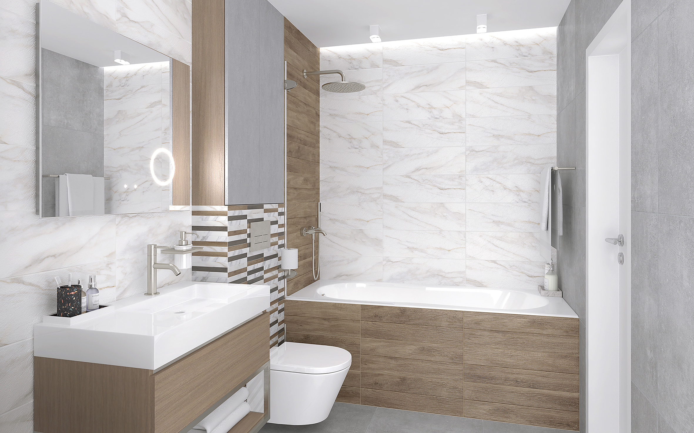 Атмосфера гармонии и спокойствия в вашей ванной комнате. Натуральные текстуры белого мрамора с дымчатыми серыми прожилками оттеняются теплыми вставками под дерево в декорах. Общее впечатление от такого интерьера — уют и нежность. Только прикоснитесь к этой плитке! Рельеф вышел таким удачным, что руку убирать уже не захочется. И это удовольствие будет с вами каждый день! Если вам кажется, что стоит добавить еще немного деревянных текстур, посмотрите на другие наши коллекции. Что-то из широкого ассортимента керамопаркета обязательно подойдет к этой коллекции! А если хочется добавить акцент — используйте яркие золотые или благородные серебряные бордюры.