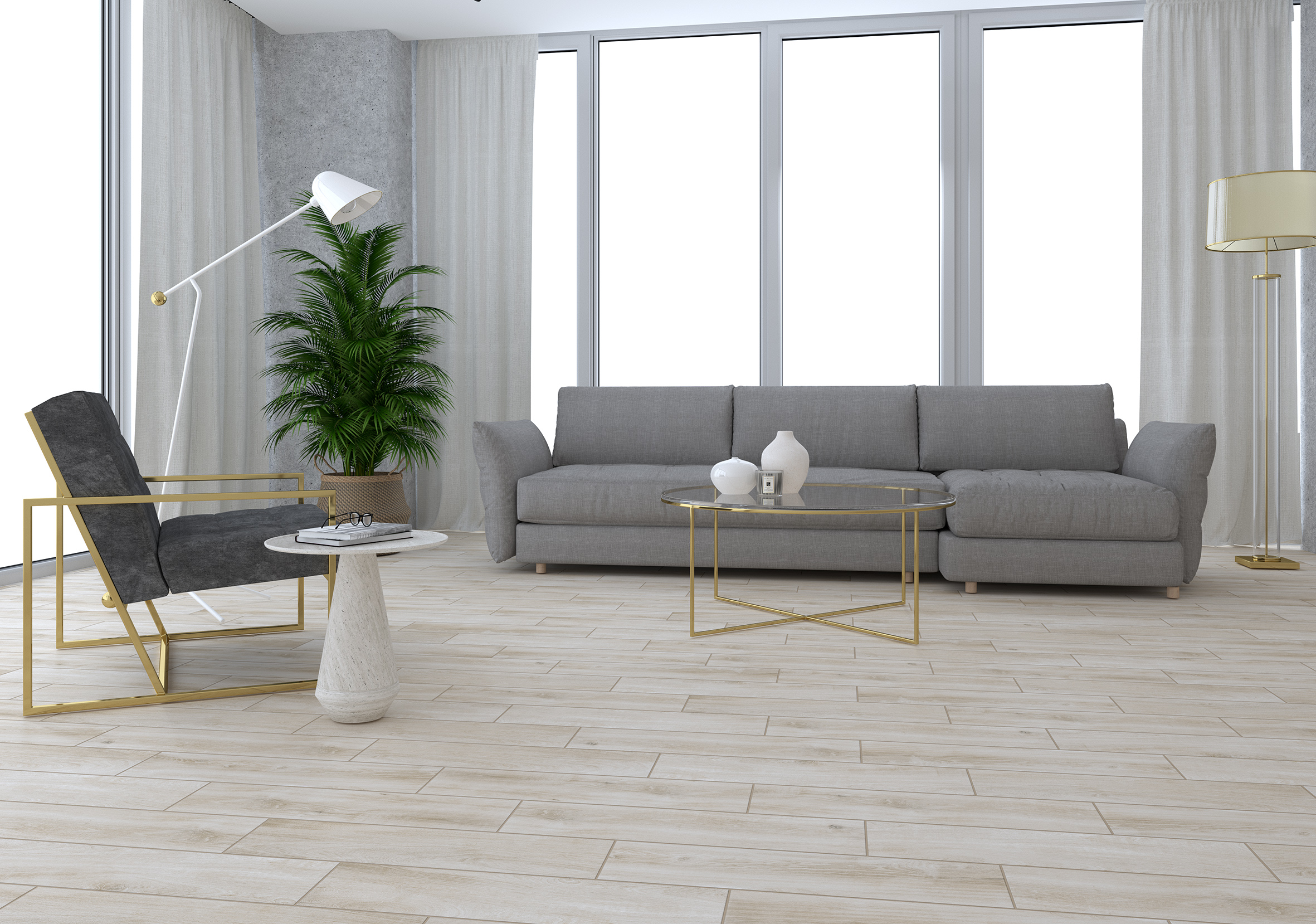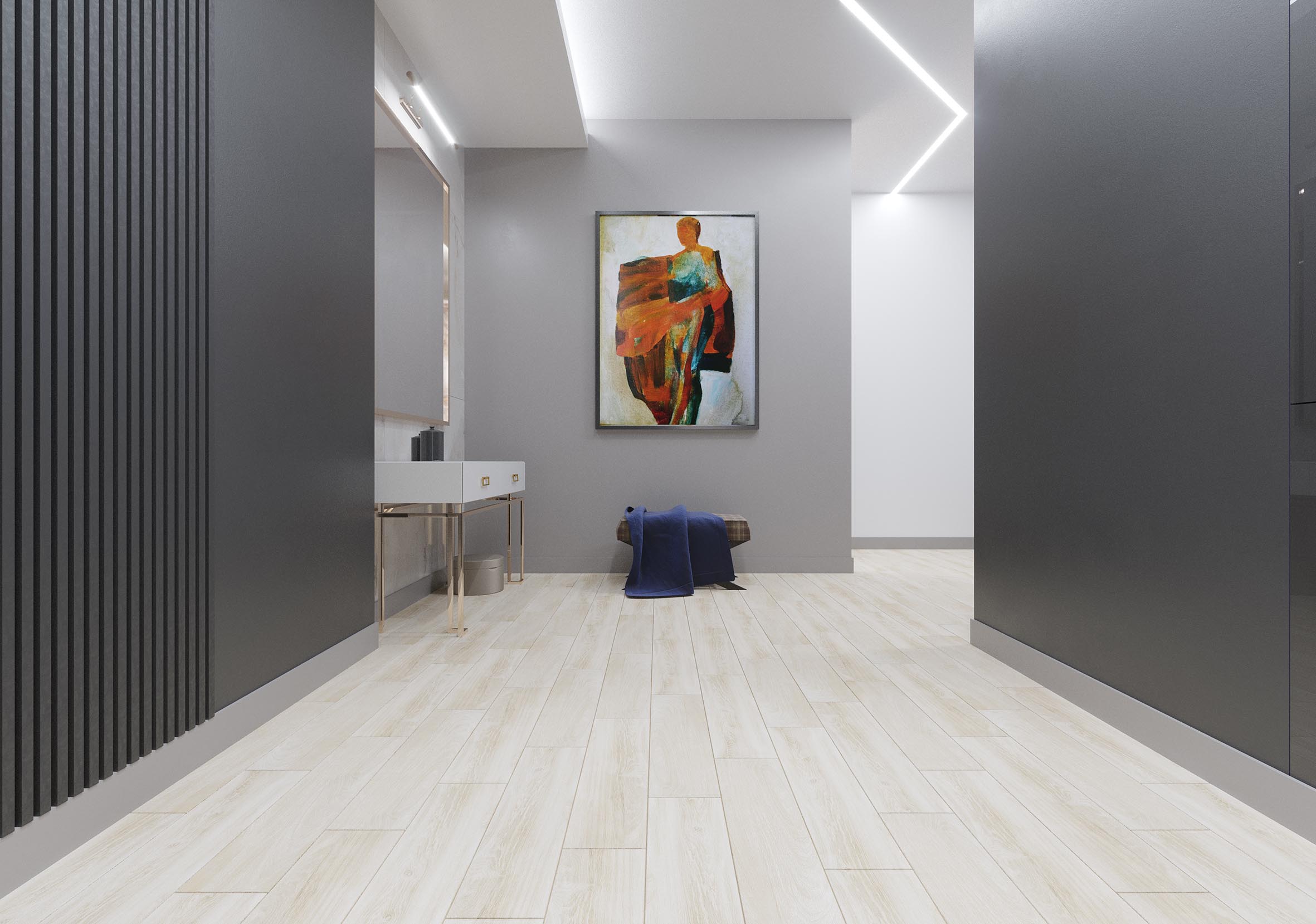 Описание Керамогранит представляет собой текстуру выбеленной сосны с натуральными прожилками, которые подчеркнуты спецэффектом deep-ink. Холодные оттенки плиты — идеальный фон
