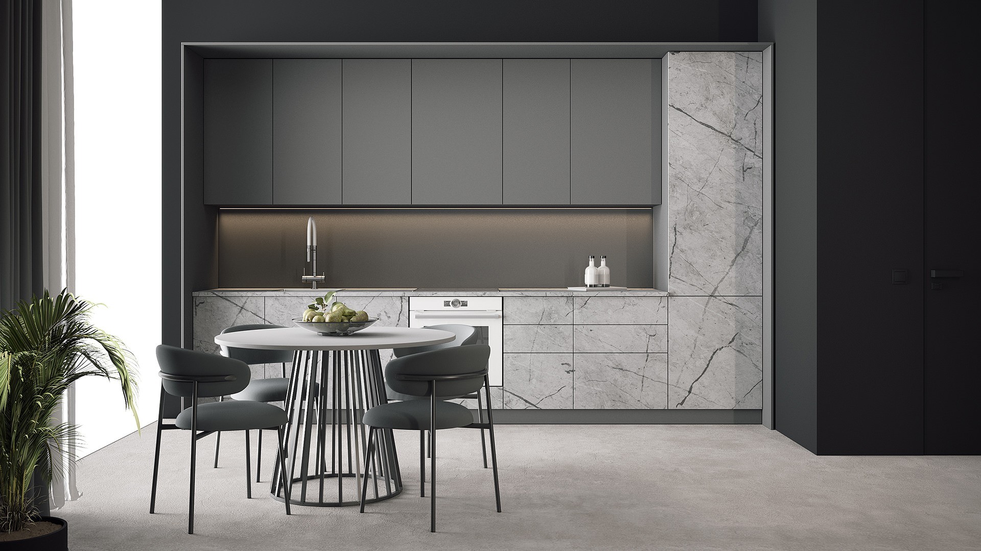 Прямая кухня Плейт в современном стиле — это стильное и практичное решение для вашей кухни. Гарнитур длиной 3,6 метра выполнен в серых оттенках и изготовлен из качественных материалов: фасады — из МДФ с покрытием пластиком HPL и термопластиком. Приглашаем вас в наш салон для просчёта проекта.