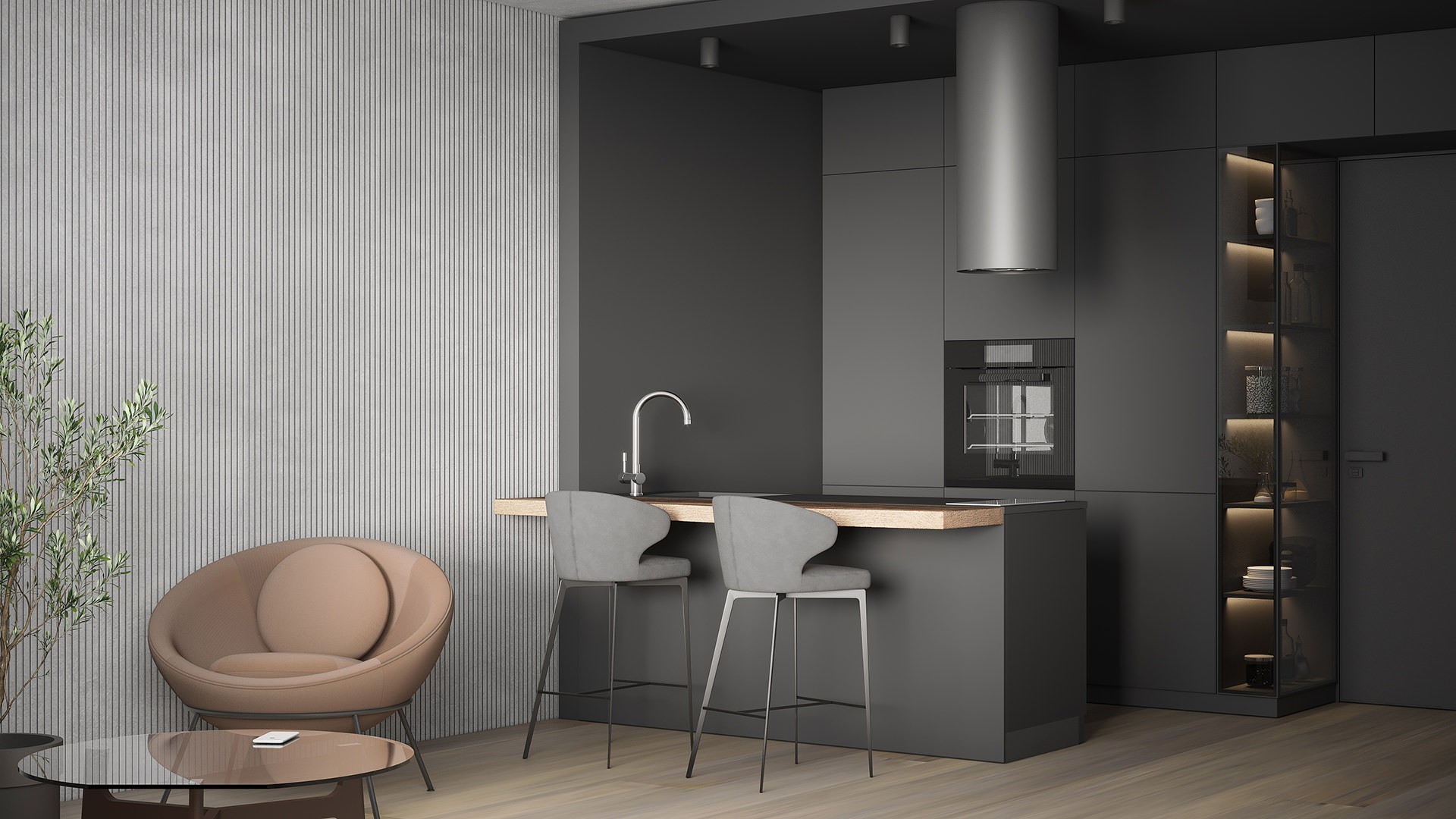 Кухня в современном стиле с фасадами из плиты AGT и интегрированной барной стойкой из натурального дерева подойдет ценителям качественных материалов. Размер колонок — 3,2 метра, размер острова — 1,8 на 0,8 метра. Приглашаем вас в салон для просчета проекта.