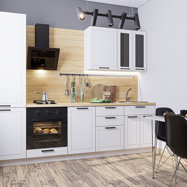 Характеристики кухни Размер (В*Ш*Г), мм2140*2700*600 Цвет каркасовДуб Вотан Материал каркасовЛДСП Цвет фасадовМаренго Силк Материал фасадовМДФ/Стекло Отделка фасадовПленка ПВХ «Soft Touch».