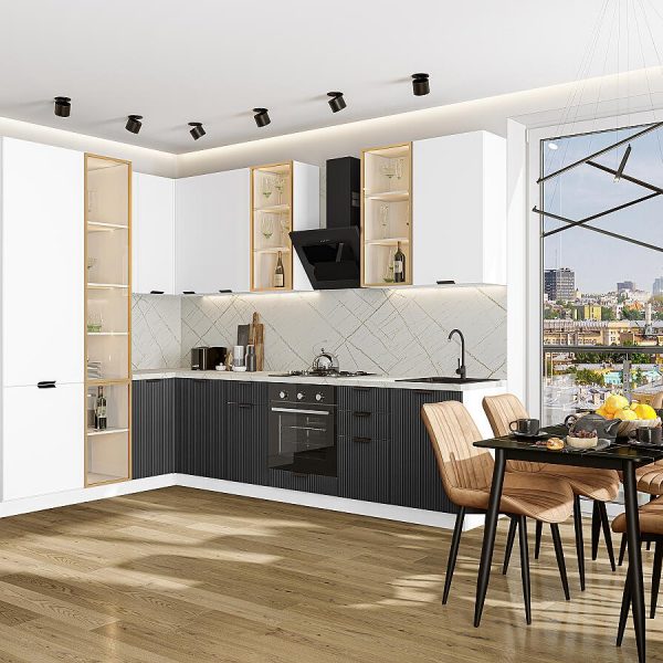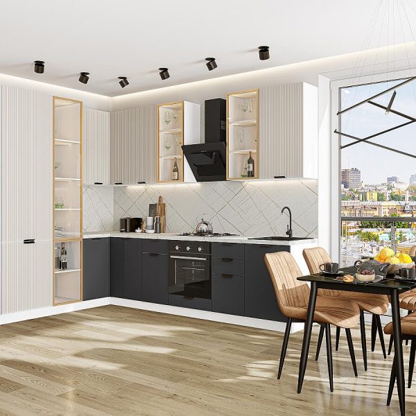 Характеристики кухни Размер (В*Ш*Г), мм2340*2000/3000*600 Цвет каркасовБелый Материал каркасовЛДСП Цвет фасадовАнтрацит/Белый Материал фасадовМДФ Отделка фасадовПленка ПВХ. Полезная информацияВнимание! Ручка в