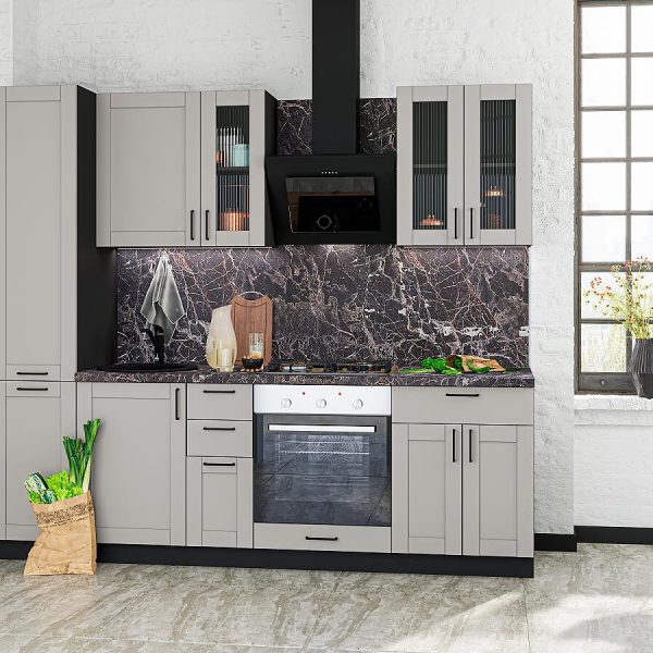 Характеристики кухни Размер (В*Ш*Г), мм2140*2400*600 Цвет каркасовGraphite Материал каркасовЛДСП Цвет фасадовSuper White Материал фасадовМДФ/Стекло Отделка фасадовВинил — структурный материал с