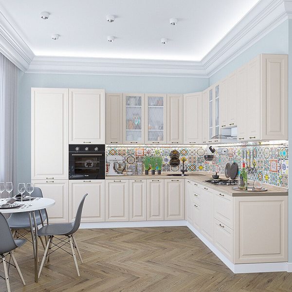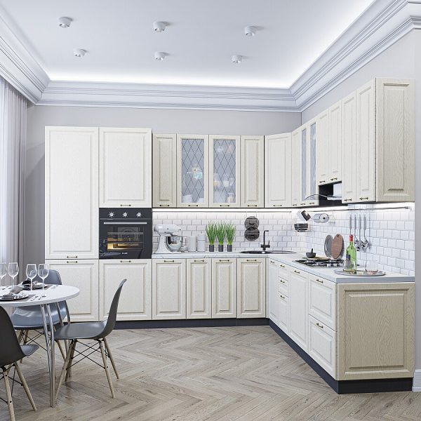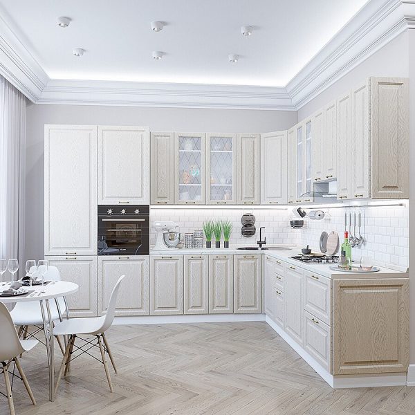 Характеристики кухни Размер (В*Ш*Г), мм2340*3200/2700*600 Цвет каркасовБелый Материал каркасовЛДСП Цвет фасадовДуб крем Материал фасадовМДФ/Стекло Отделка фасадовПленка ПВХ. Полезная информацияВ комплект