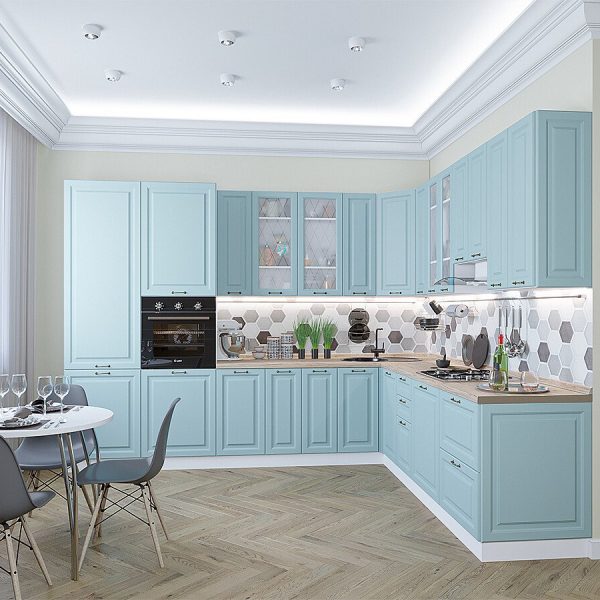 Характеристики кухни Размер (В*Ш*Г), мм2340*3200/2700*600 Цвет каркасовБелый Материал каркасовЛДСП Цвет фасадовГолубой Материал фасадовМДФ/Стекло Отделка фасадовПленка ПВХ. Полезная информацияВ комплект входит: