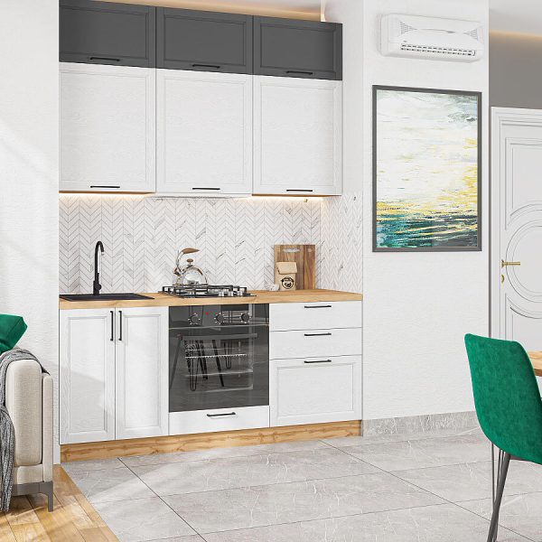 Характеристики кухни Размер (В*Ш*Г), мм2140*1200*600 Цвет каркасовБелый Материал каркасовЛДСП Цвет фасадовWhite Softwood/Graphite Softwood Материал фасадовМДФ Отделка фасадовЭко Шпон с уникальным