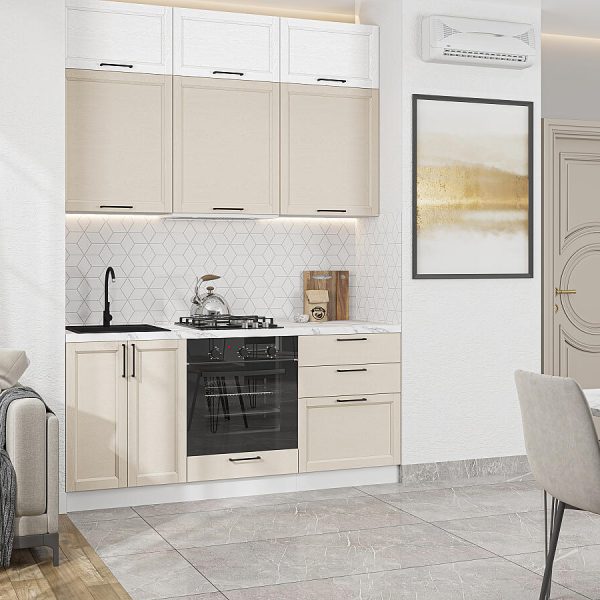 Характеристики кухни Размер (В*Ш*Г), мм2140*1200*600 Цвет каркасовБелый Материал каркасовЛДСП Цвет фасадовCream Silkwood Материал фасадовМДФ Отделка фасадовПЭТ Полезная информацияВнимание! Ручка в