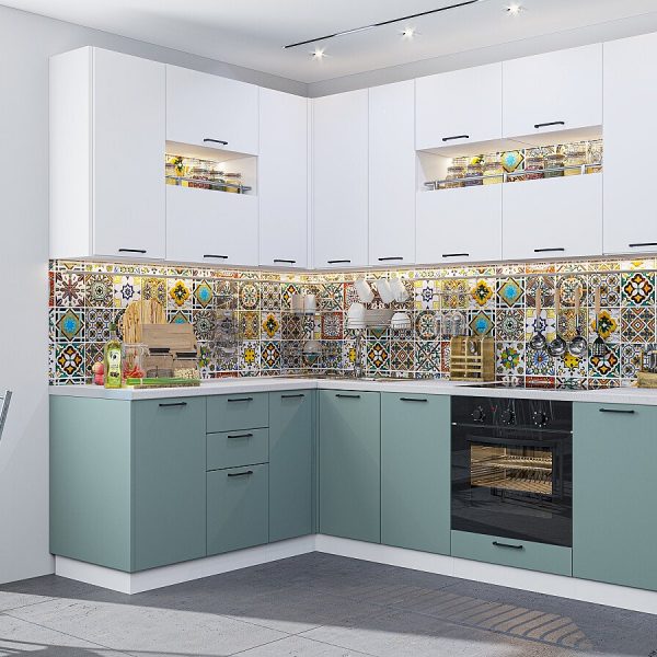 Характеристики кухни Размер (В*Ш*Г), мм2340*1700/2400*600 Цвет каркасовБелый Материал каркасовЛДСП Цвет фасадовWhite In 2S/Grey-green In 2S Материал фасадовЛДСП Толщина кромки, мм1