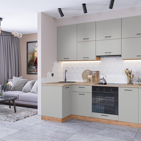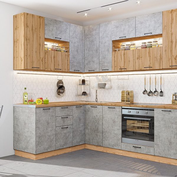 Характеристики кухни Размер (В*Ш*Г), мм2340*1000/2500*600 Цвет каркасовДуб Вотан Материал каркасовЛДСП Цвет фасадовLight Grey In 2S Материал фасадовЛДСП Толщина кромки, мм1