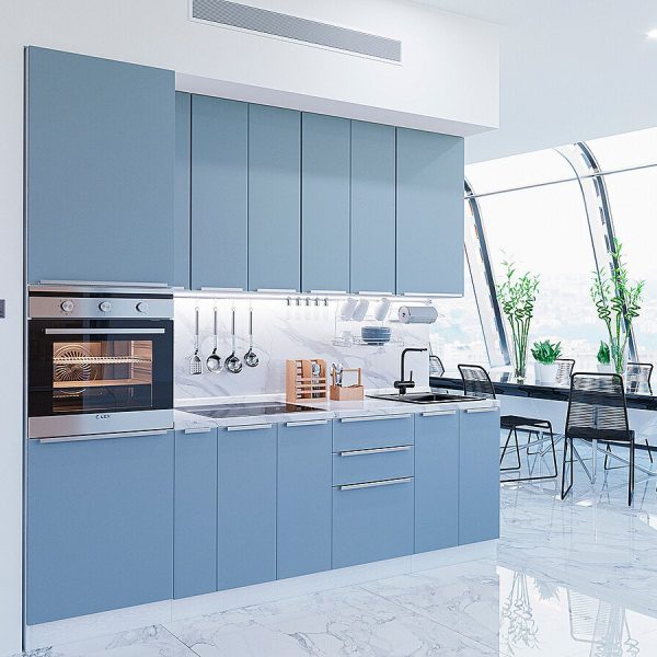 Характеристики кухни Размер (В*Ш*Г), мм2340*2600*600 Цвет каркасовБелый Материал каркасовЛДСП Цвет фасадовSilky Blue Материал фасадовМДФ Отделка фасадовПЭТ Толщина кромки, мм1 Полезная
