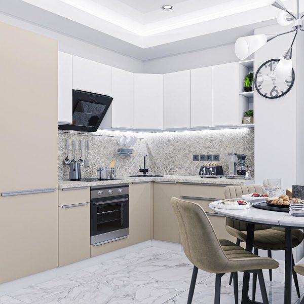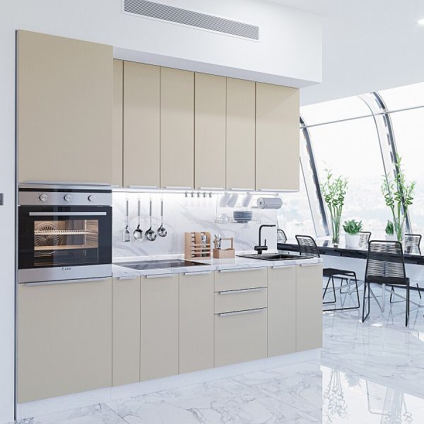 Характеристики кухни Размер (В*Ш*Г), мм2140*2500/1800*600 Цвет каркасовБелый Материал каркасовЛДСП Цвет фасадовCream Silk/Silky White Материал фасадовМДФ Отделка фасадовПЭТ Толщина кромки, мм1