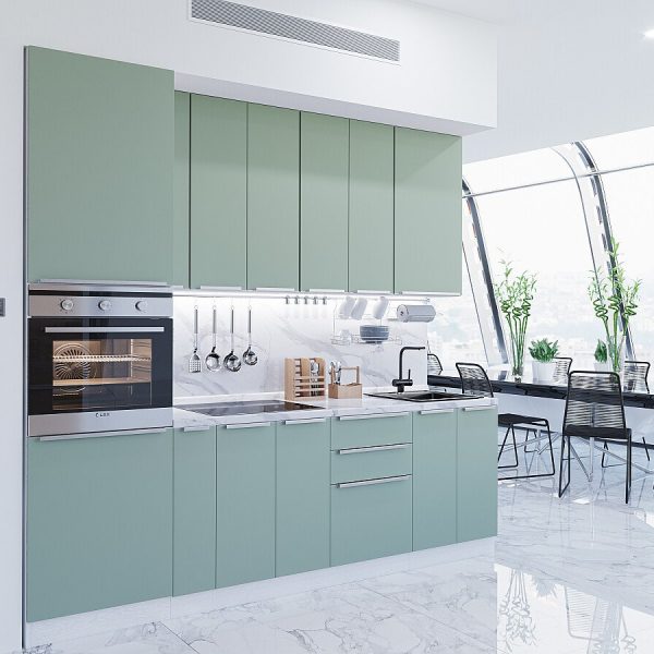 Характеристики кухни Размер (В*Ш*Г), мм2340*2600*600 Цвет каркасовБелый Материал каркасовЛДСП Цвет фасадовSilky Mint Материал фасадовМДФ Отделка фасадовПЭТ Толщина кромки, мм1 Полезная