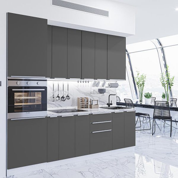 Характеристики кухни Размер (В*Ш*Г), мм2140*2600*600 Цвет каркасовБелый Материал каркасовЛДСП Цвет фасадовAnthracite Материал фасадовМДФ Отделка фасадовАкрилит Толщина кромки, мм1 Полезная информацияВнимание!