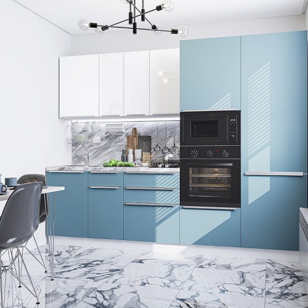 Характеристики кухни Размер (В*Ш*Г), мм2140*2700*600 Цвет каркасовБелый Материал каркасовЛДСП Цвет фасадовAngel/Silky Blue Материал фасадовМДФ Отделка фасадовПЭТ/Акрилит Толщина кромки, мм1 Полезная