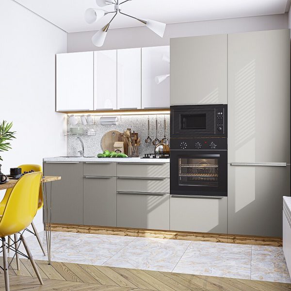 Характеристики кухни Размер (В*Ш*Г), мм2140*1100*600 Цвет каркасовБелый Материал каркасовЛДСП Цвет фасадовSilky Light Grey Материал фасадовМДФ Отделка фасадовПЭТ Толщина кромки, мм1