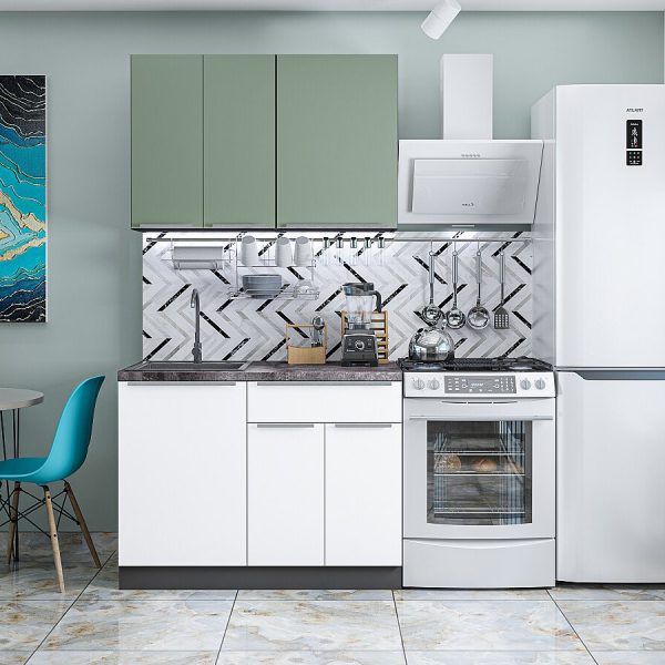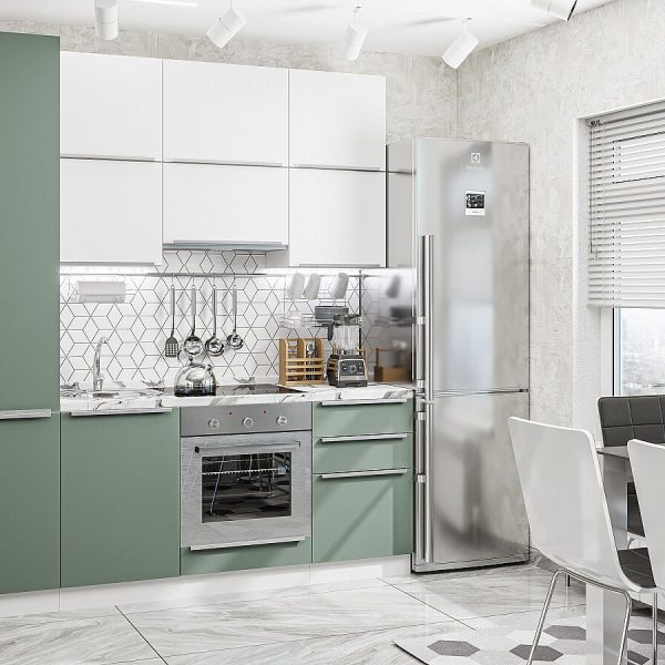 Характеристики кухни Размер (В*Ш*Г), мм2340*2000*600 Цвет каркасовБелый Материал каркасовЛДСП Цвет фасадовSilky White/Silky Mint Материал фасадовМДФ Отделка фасадовПЭТ Толщина кромки, мм1