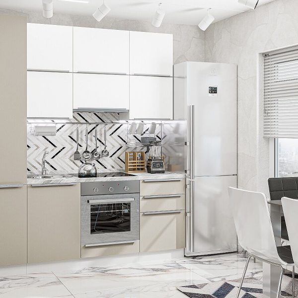Характеристики кухни Размер (В*Ш*Г), мм2340*2000*600 Цвет каркасовБелый Материал каркасовЛДСП Цвет фасадовSilky White/Stormy Silk Материал фасадовМДФ Отделка фасадовПЭТ Толщина кромки, мм1
